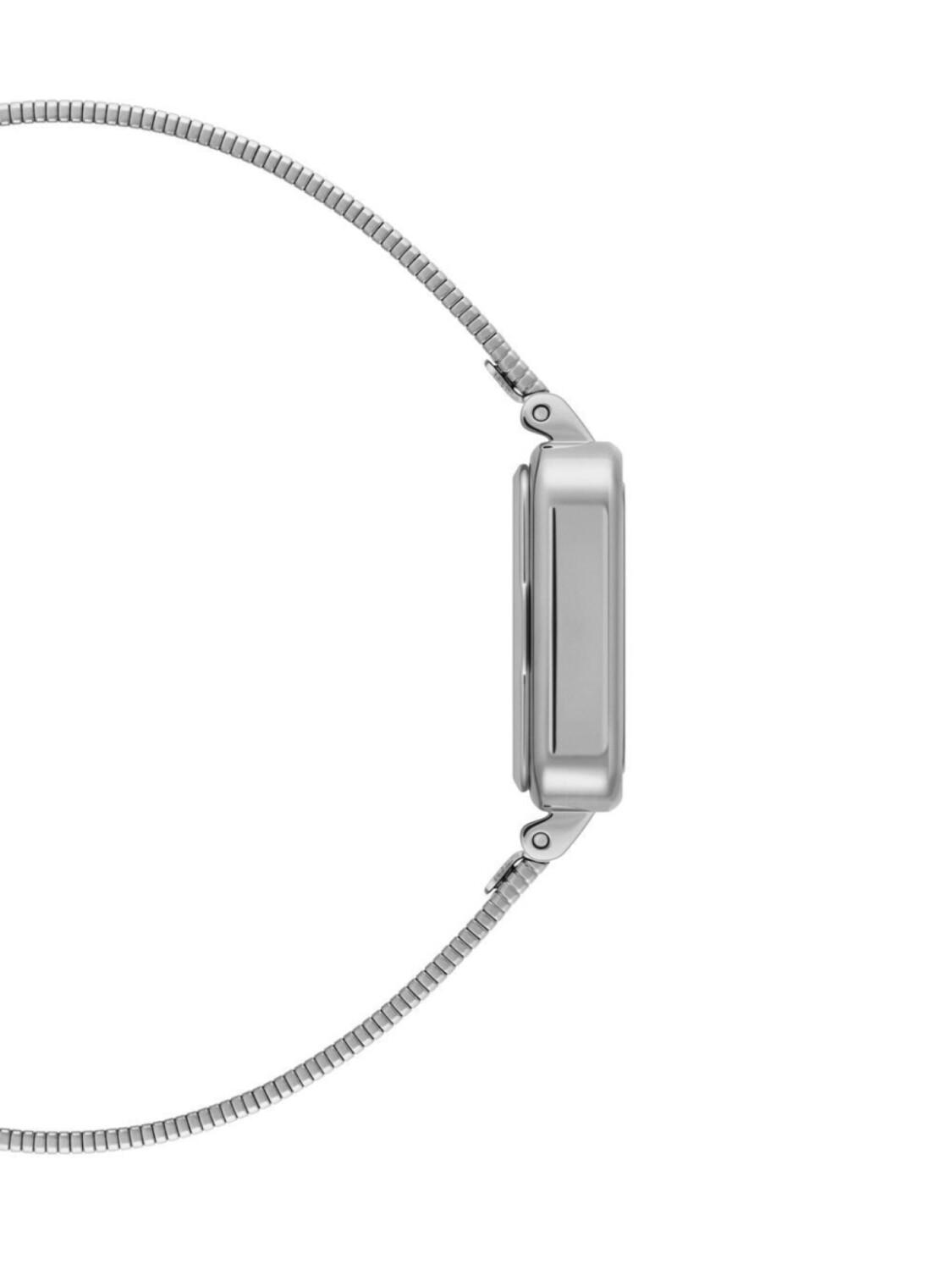 Серебристый, молочный, нержавеющая сталь, тонкие закругленные стрелки, кварцевый механизм, квадратный корпус и раскладная застежка.