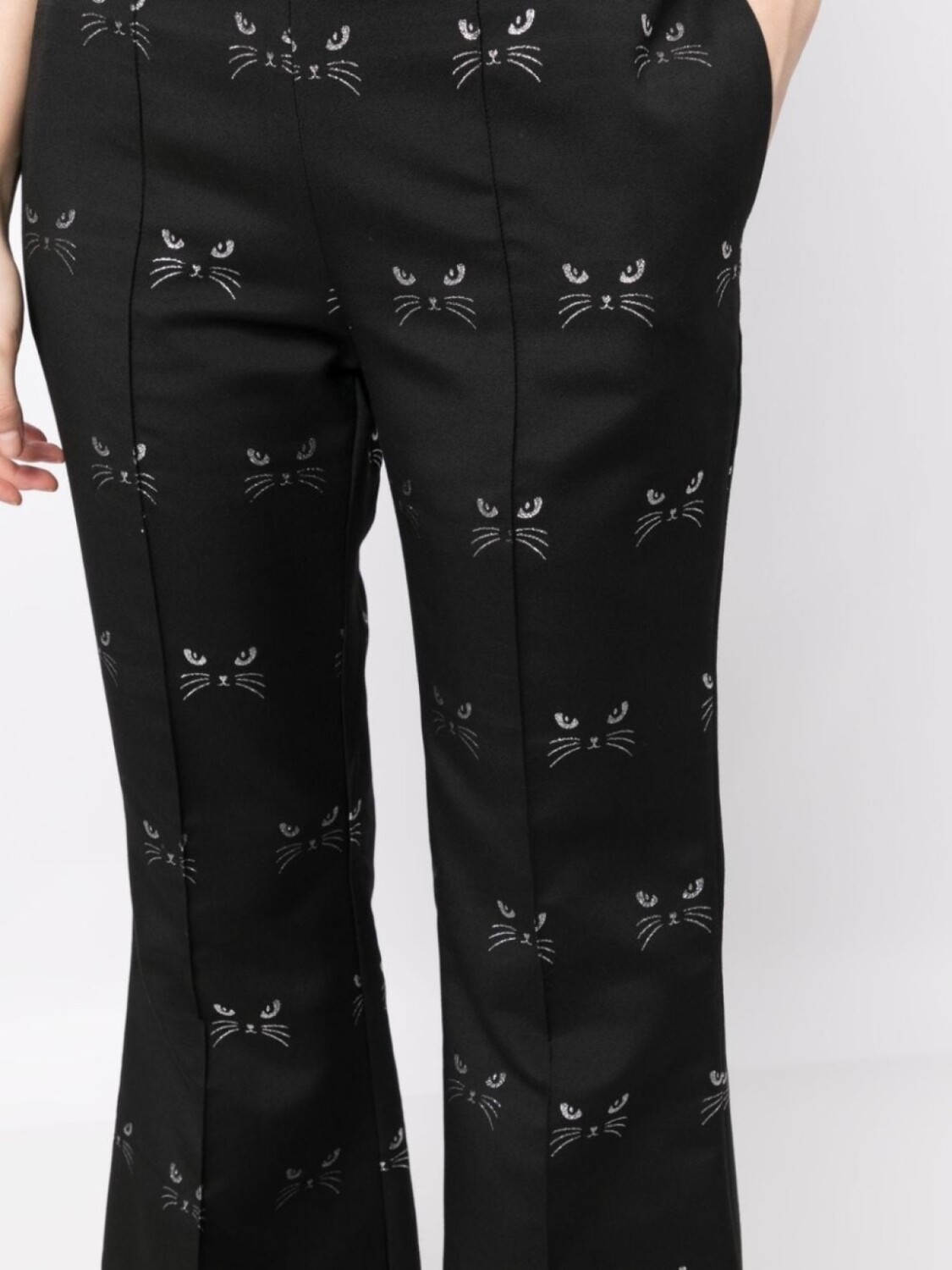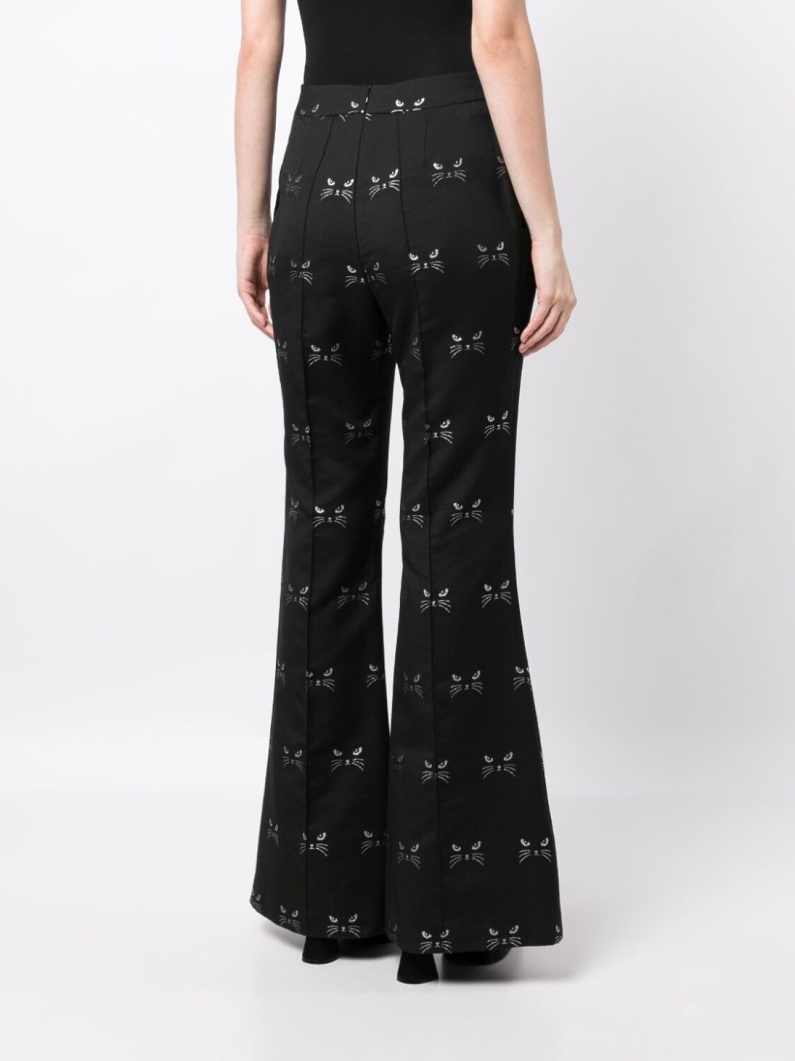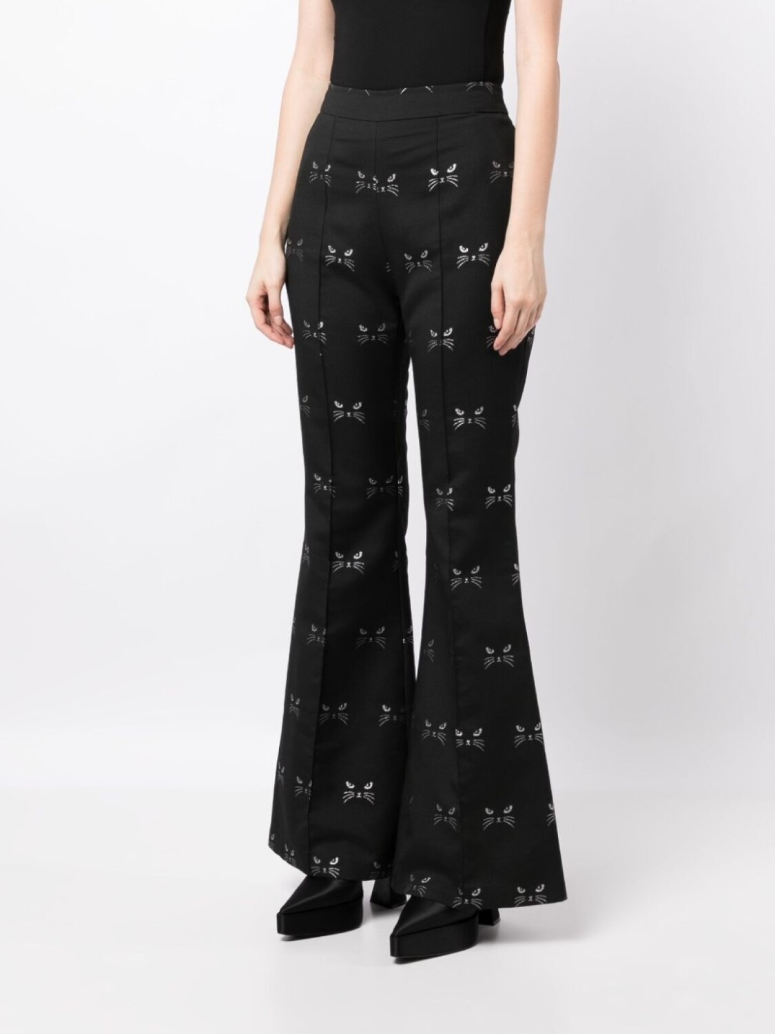 Черный, серебристый, жаккардовый материал с узором, мультипликационный принт, вытачки, расклешенный крой, потайная застежка на молнии сзади, два прорезных кармана по бокам и прямой подол.