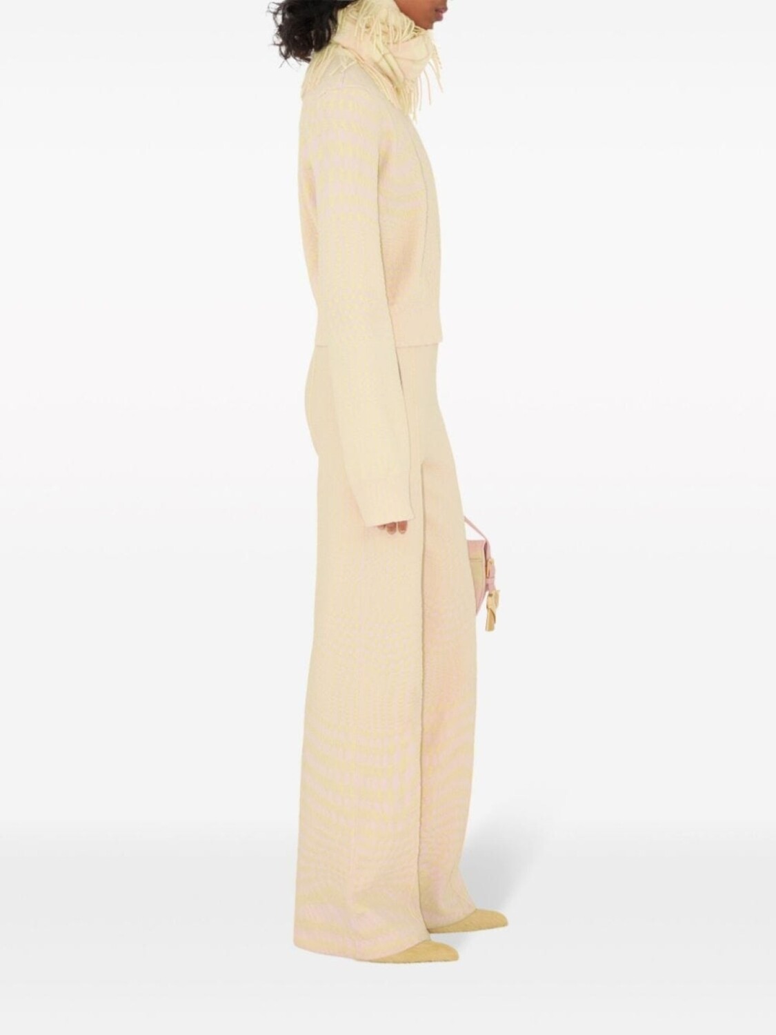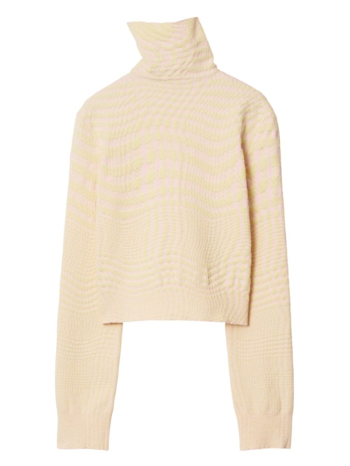 Кремово-белый, светло-желтый, эластичная шерсть, жаккардовый материал с узором, оптический принт, узор в ломаную клетку, высокий воротник, воротник с разрезом и длинные рукава.