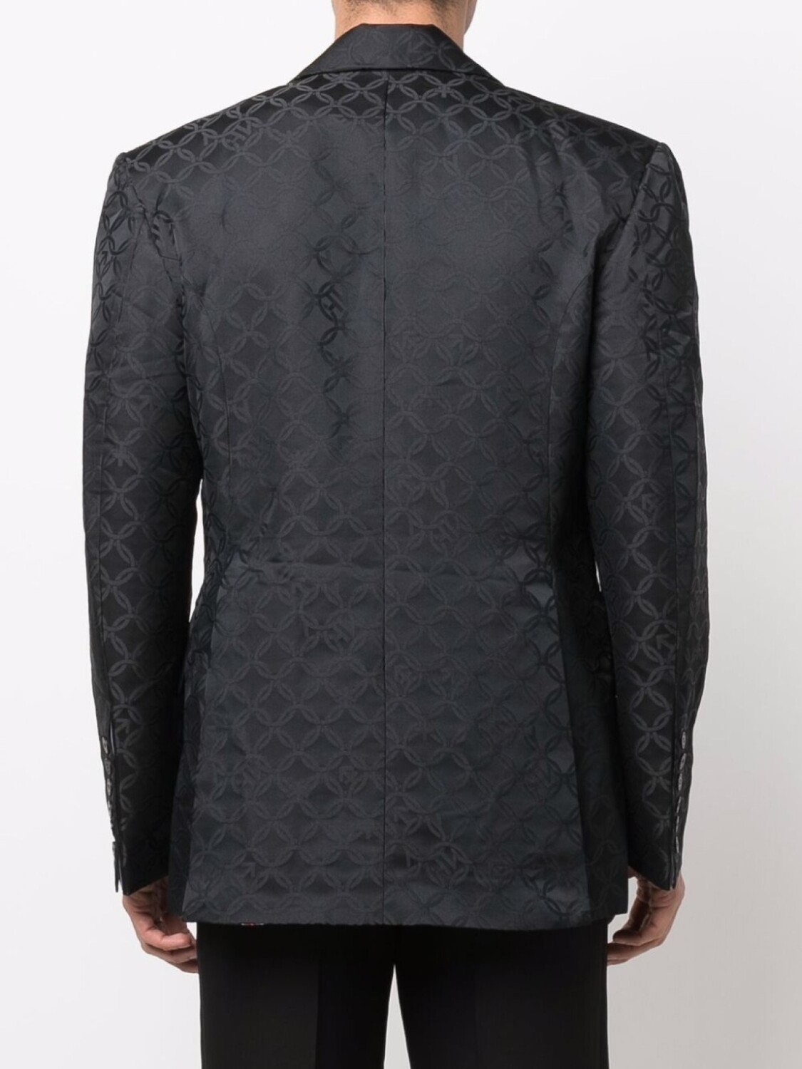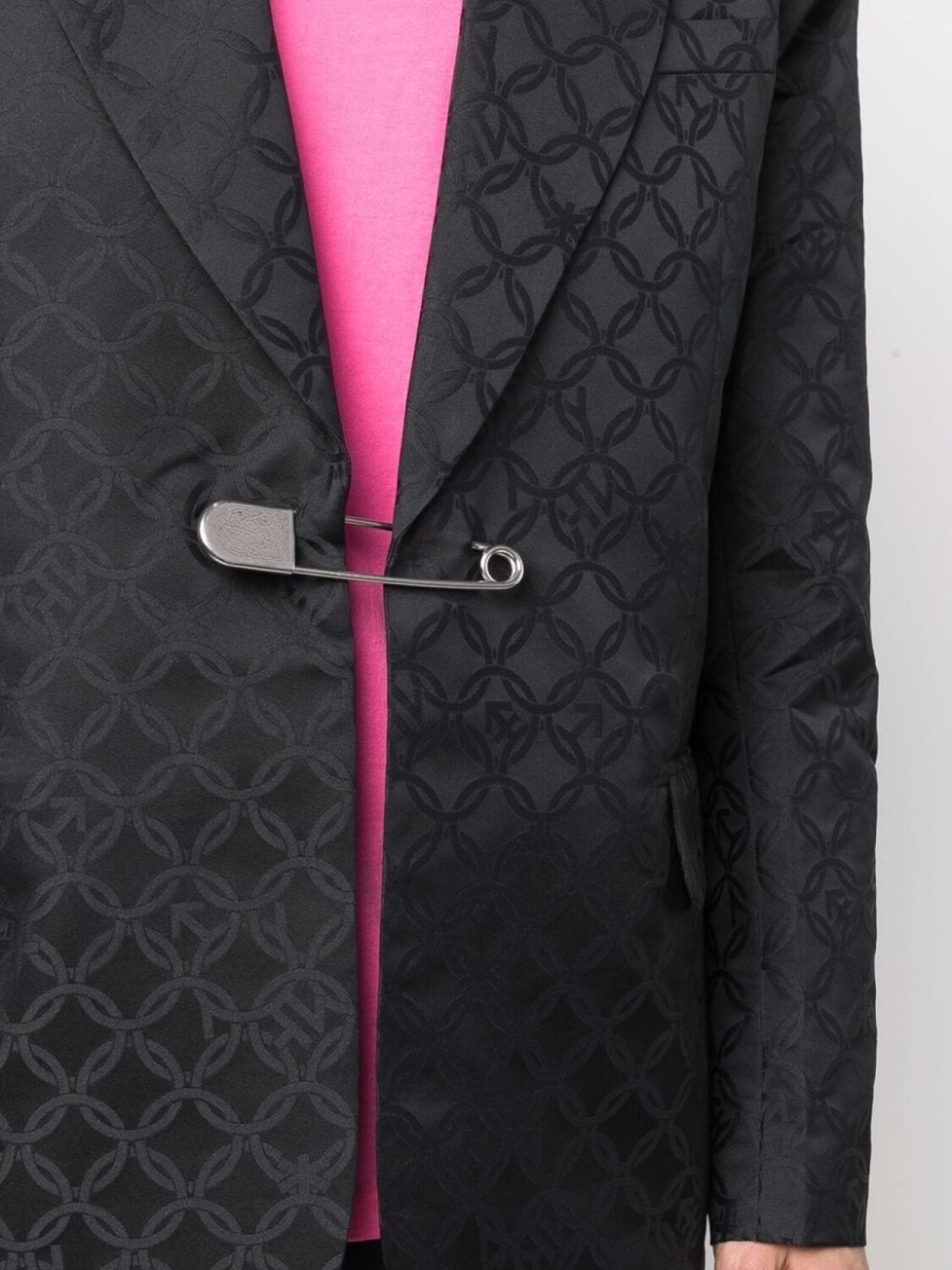 Жаккардовый материал с узором, декоративная булавка, зазубренные лацканы, прорезной карман на груди, два передних кармана с клапанами, длинные рукава, прямой подол и две боковые шлицы сзади. Цвет: черный.