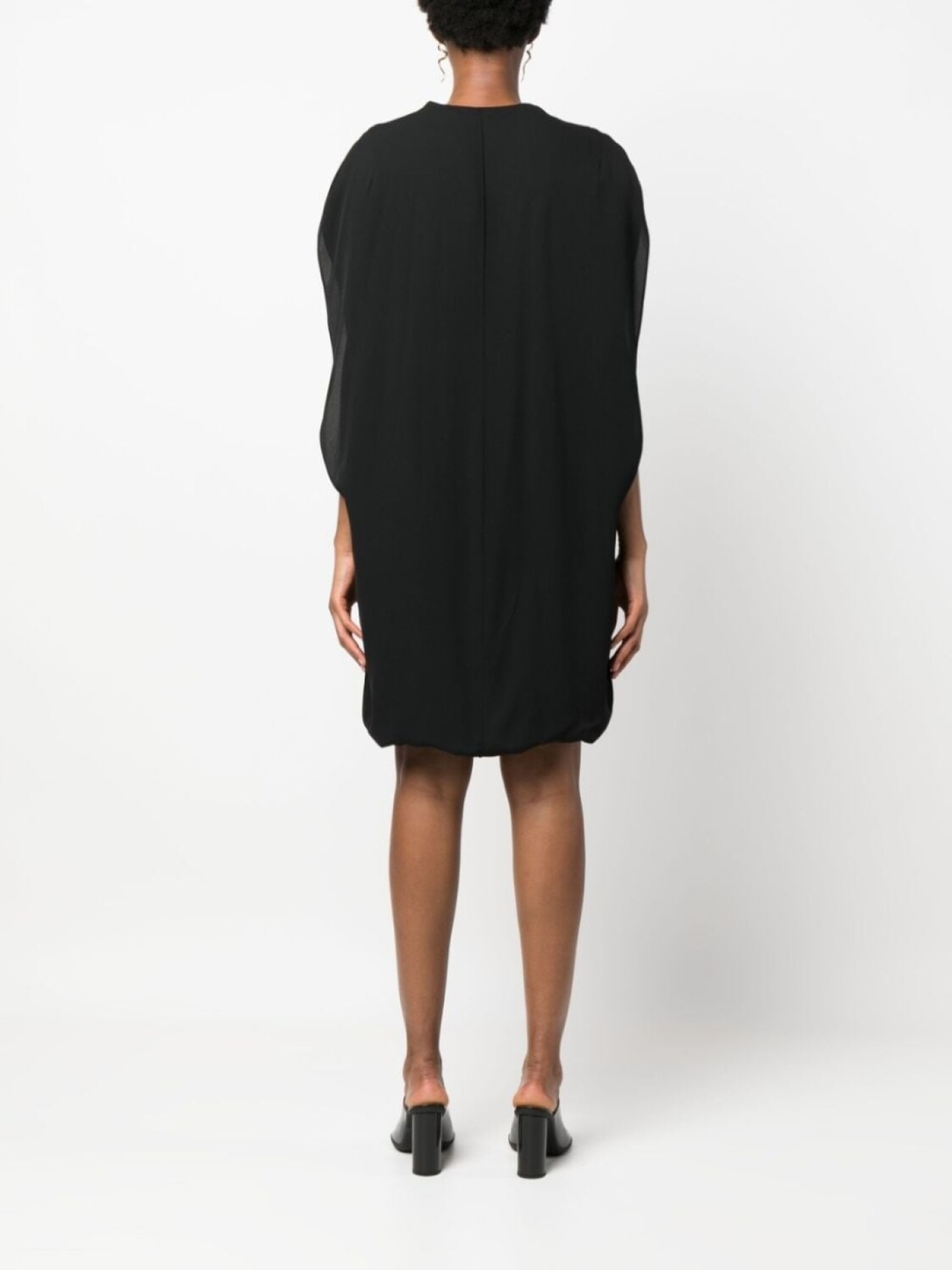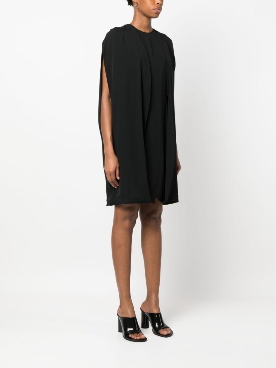 Черный, шелк, драпировка, круглый вырез, застежка на молнии сзади, приспущенные плечи, без рукавов, силуэт трапеция и длина выше колена.