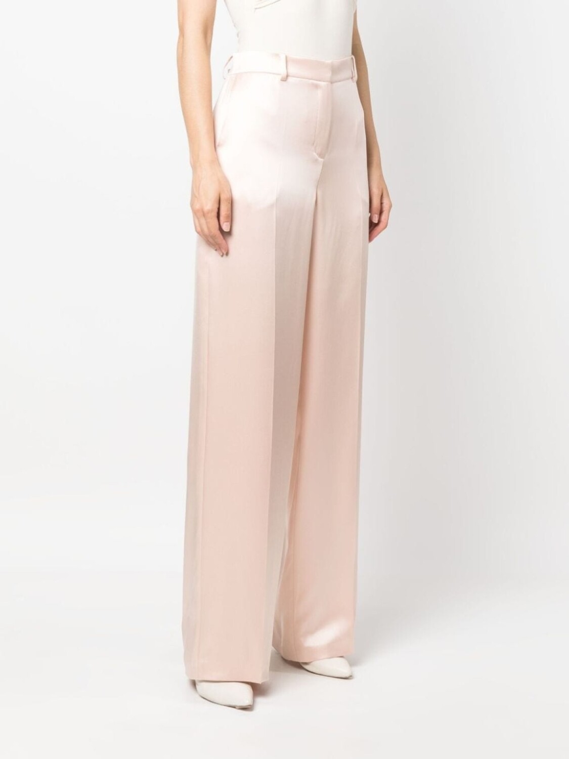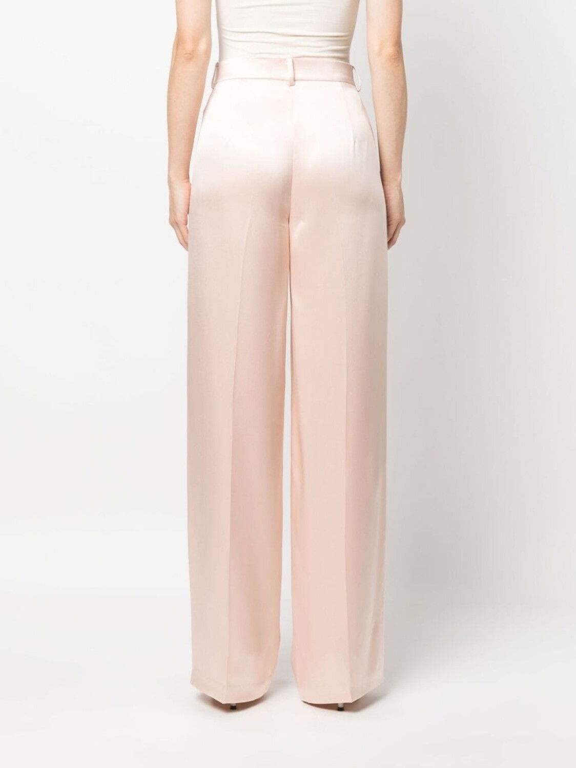 Персиково-розовый, шелк, средняя посадка, петли для ремня, застежка на молнию и крючок, широкий крой, юбка со встречной складкой и два прорезных кармана по бокам.
