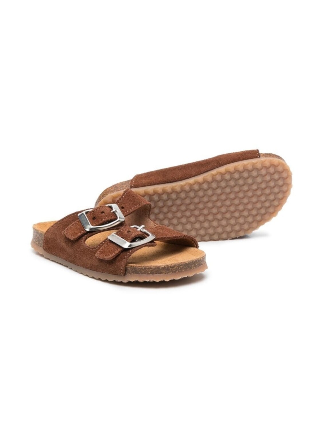Коричнево-терракотовый, замша из телячьей кожи, два ремешка с застежкой на пряжке, модель без застежки, стелька с логотипом и рифленая резиновая подошва.