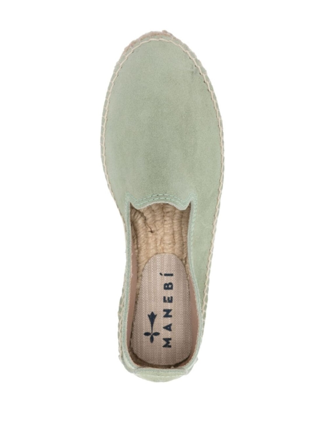 Серо-зеленый, замша из телячьей кожи, закругленный носок, тисненый логотип сзади, стелька с логотипом, плетеная подошва из рафии, резиновая подошва, без застежки