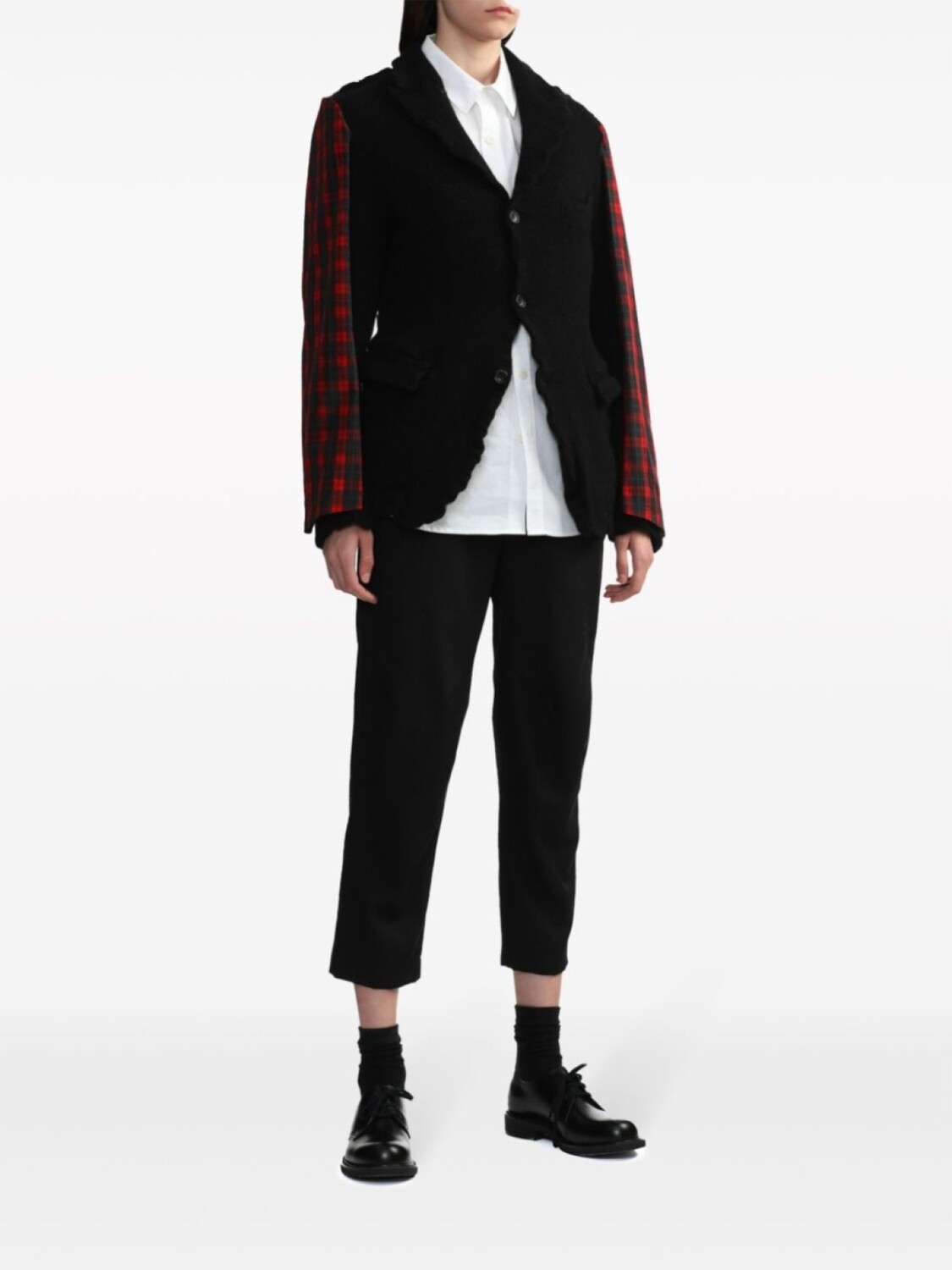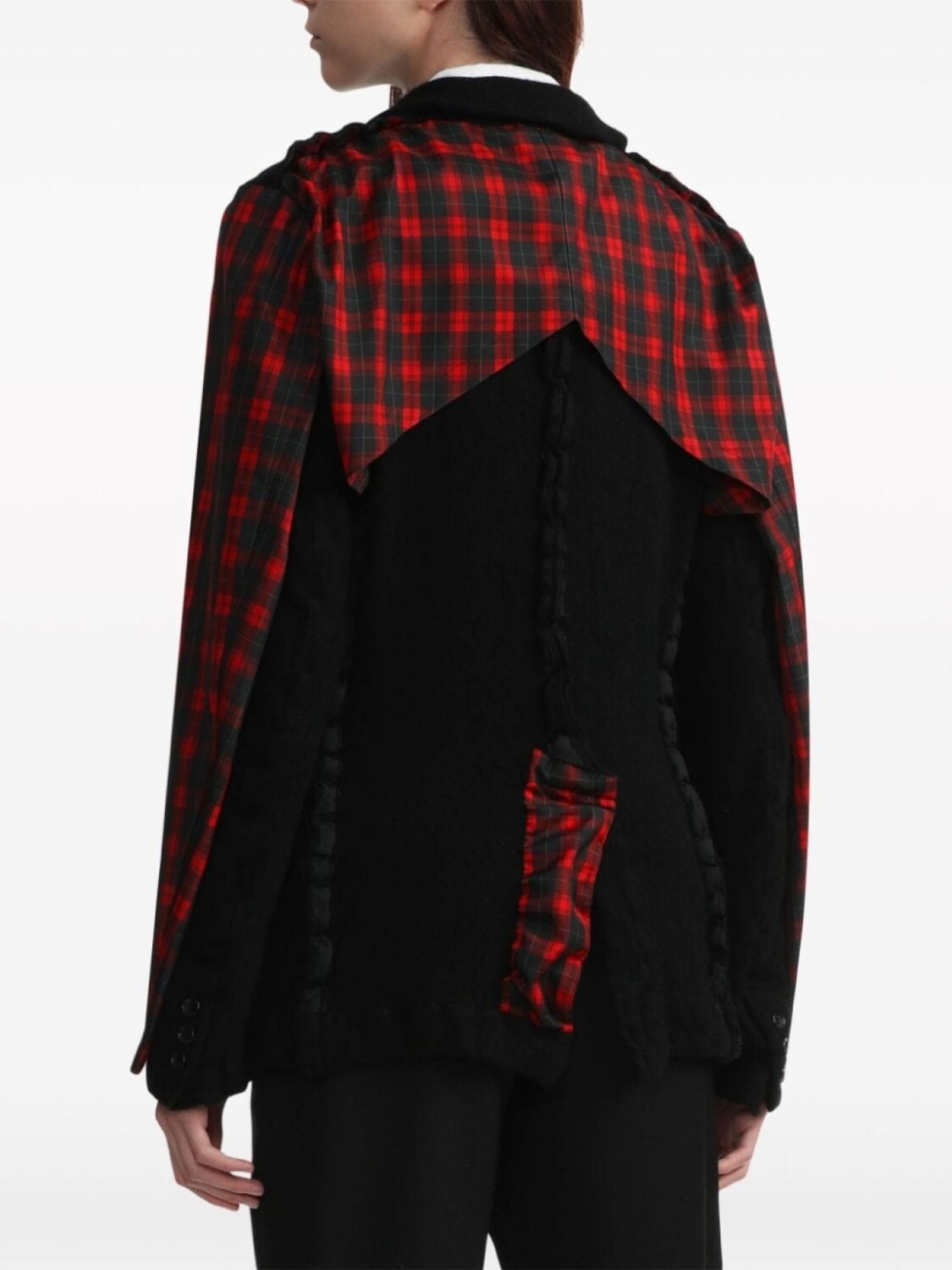 Черный/красный, смесовая шерсть, принт в клетку тартан, геометричные вставки, заостренные лацканы, застежка на пуговицах спереди, длинные рукава и отделка с оборками. Это унисекс-модель. Обратите внимание, что для нее используется мужская размерная сетка.