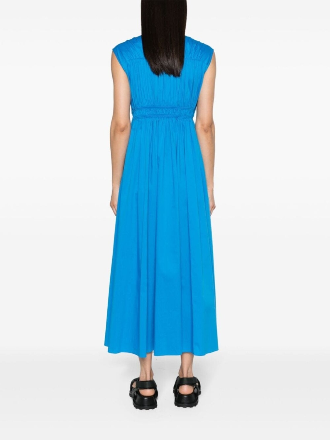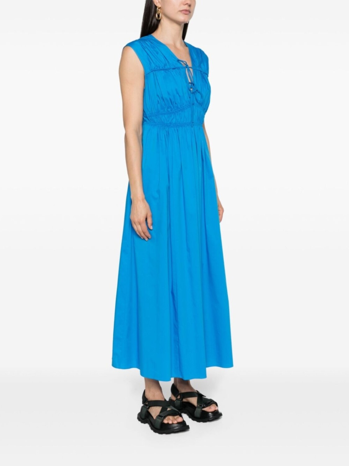 Лазурно-голубой цвет, текстура поплина, сборка, V-образный вырез, завязка спереди, потайная молния сбоку, плиссированная юбка без рукавов, два боковых прорезных кармана, прямой подол длиной до щиколотки.