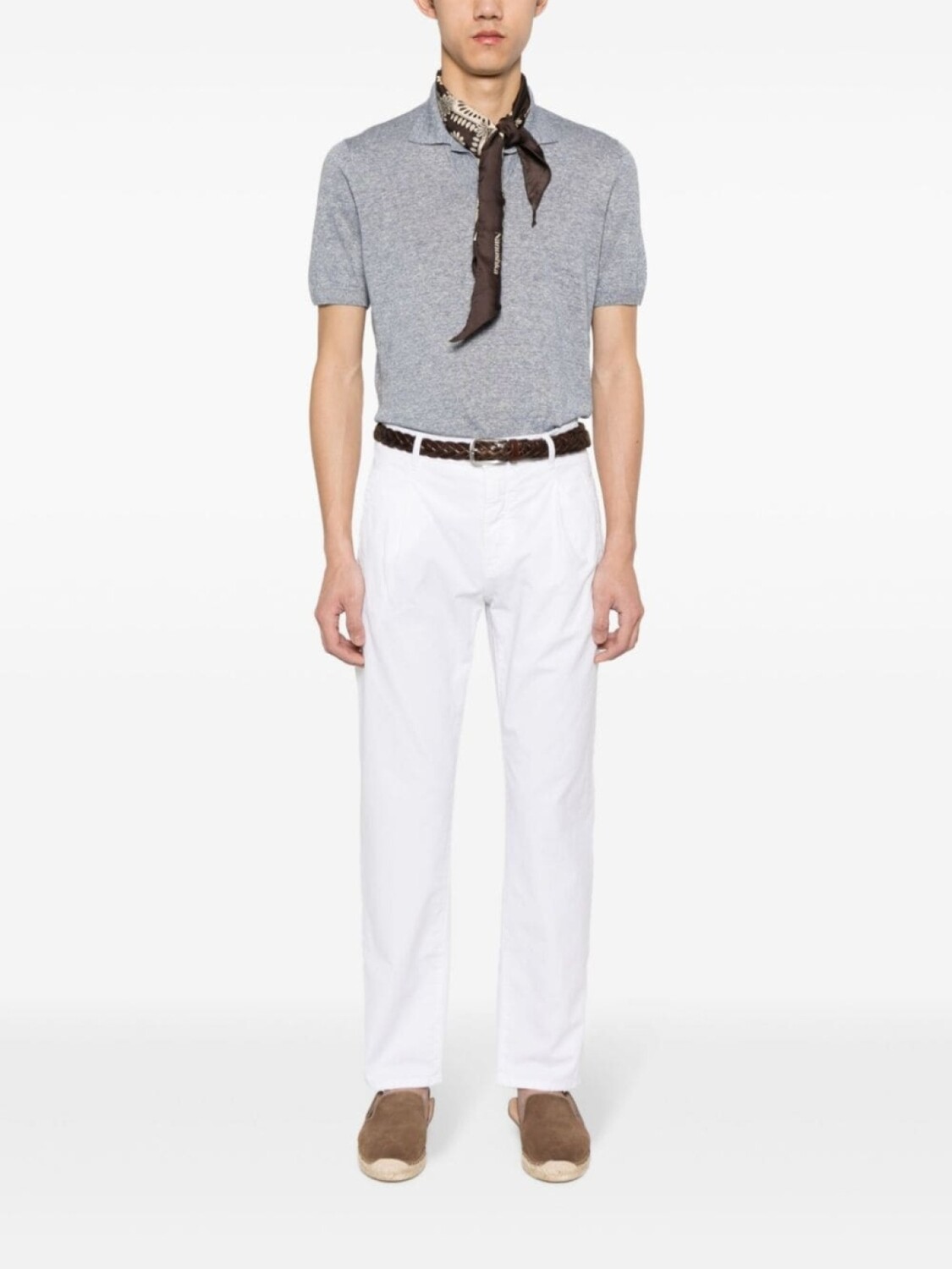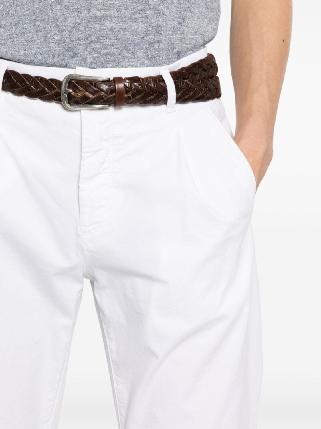 Белый, смесовый хлопок, плетение интерлок, петли для ремня, складки, стрелки, два прорезных кармана спереди, два накладных кармана сзади, нашивка с логотипом сзади, зауженный крой, планка на пуговицах спереди
