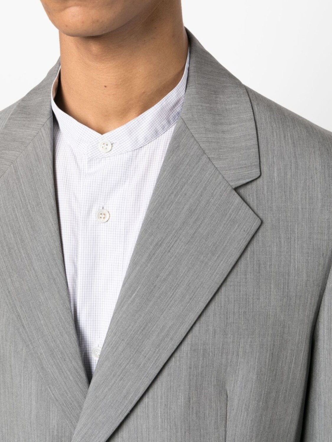Серый, смесь необработанной шерсти и мохера, классические лацканы, два передних кармана с клапанами, застежка на пуговицах спереди, подплечники, длинные рукава и прямой подол.