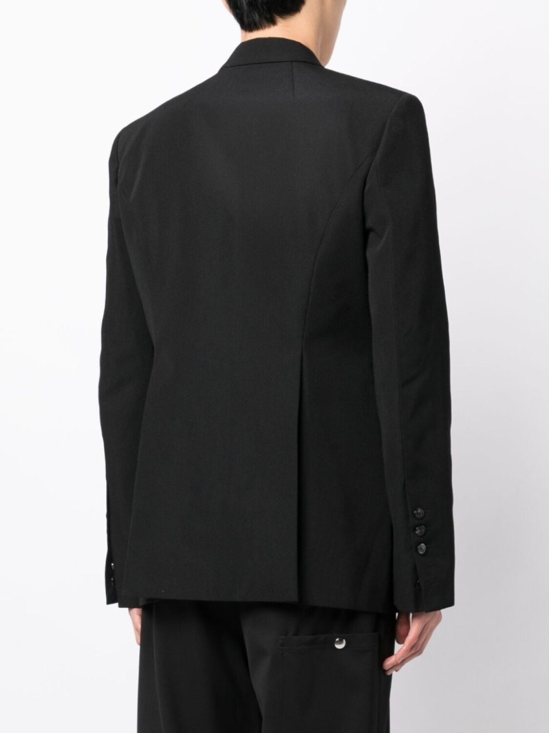 Черный, швы, заостренные лацканы, застежка на пуговицах спереди, длинные рукава и шлица по центру сзади.