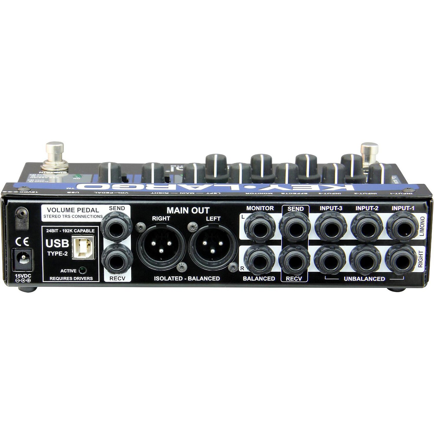 Каждый стереовход оснащен индивидуальным регулятором уровня для быстрой настройки на сцене, а также петлей эффектов для подключения внешнего мультиэффектного устройства. Затем петлю эффектов можно включить или выключить с помощью встроенного ножного переключателя, чтобы активировать эхо или реверберацию при соло. Шина эффектов является стереофонической, но при использовании педалей гитарного типа ее можно суммировать в моно. Встроенный педальный переключатель сустейна позволяет подключить Key-Largo к основной клавиатуре или цифровому пианино с помощью стандартного гитарного кабеля, что устраняет необходимость носить с собой отдельный ножной переключатель сустейна.
