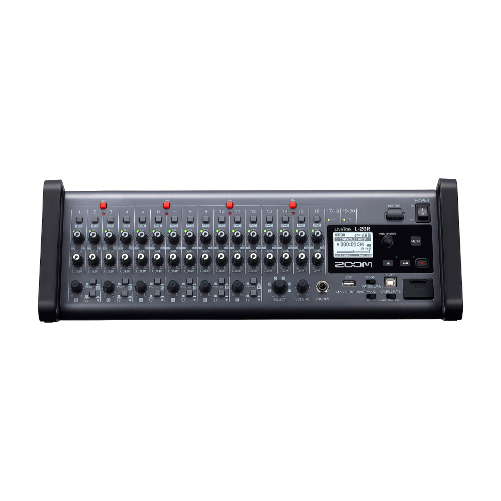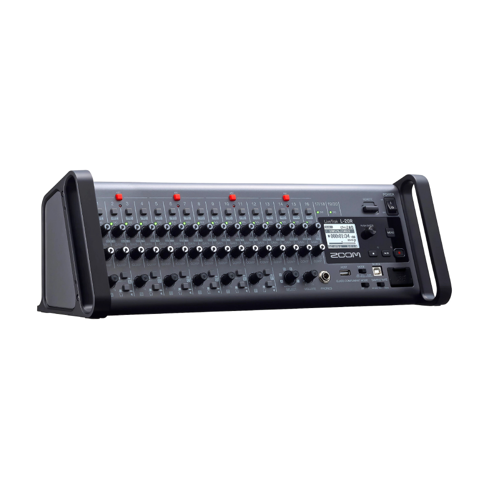 Мощный цифровой микшер с возможностью записи. Zoom LiveTrak™ L-20R — это монтируемый в стойку цифровой микшер, который позволяет музыкантам управлять своим живым миксом прямо со сцены. Благодаря беспроводному управлению, 20 дискретным каналам, 22 дорожкам записи и шести пользовательским мониторным миксам L-20R предлагает комплексное решение для любого места проведения.