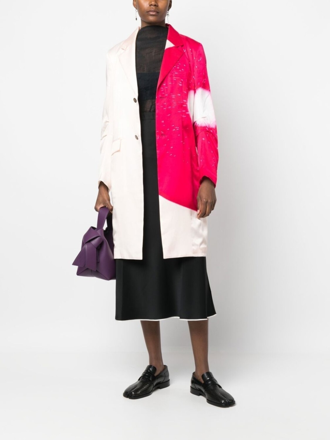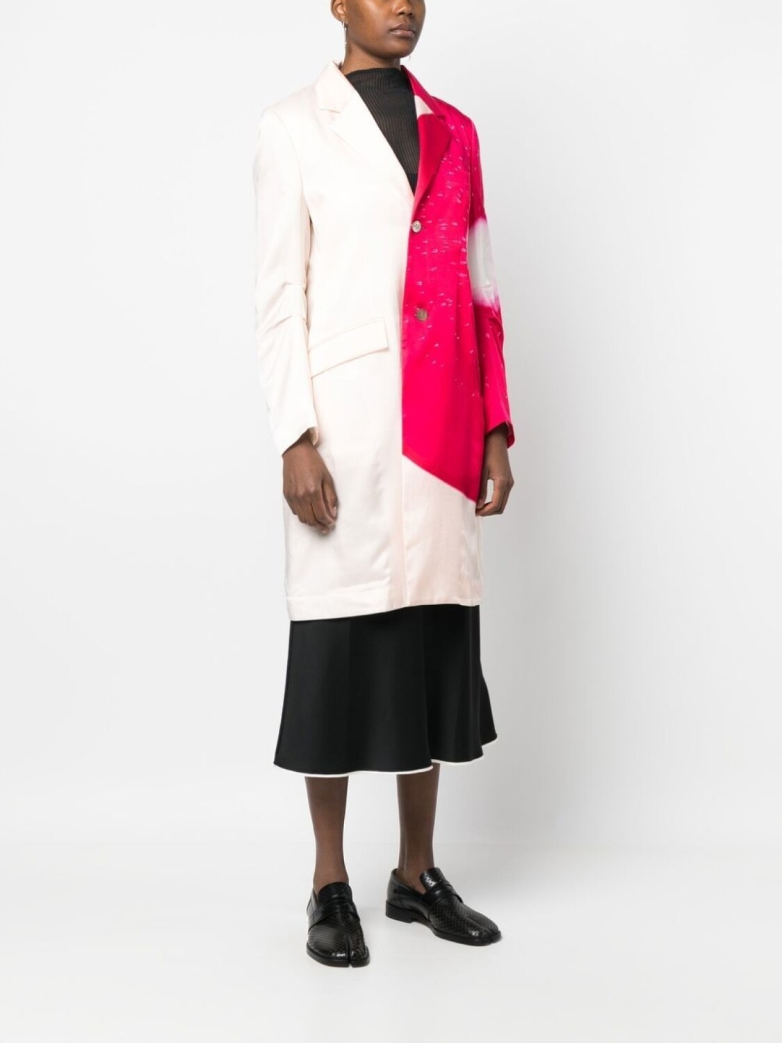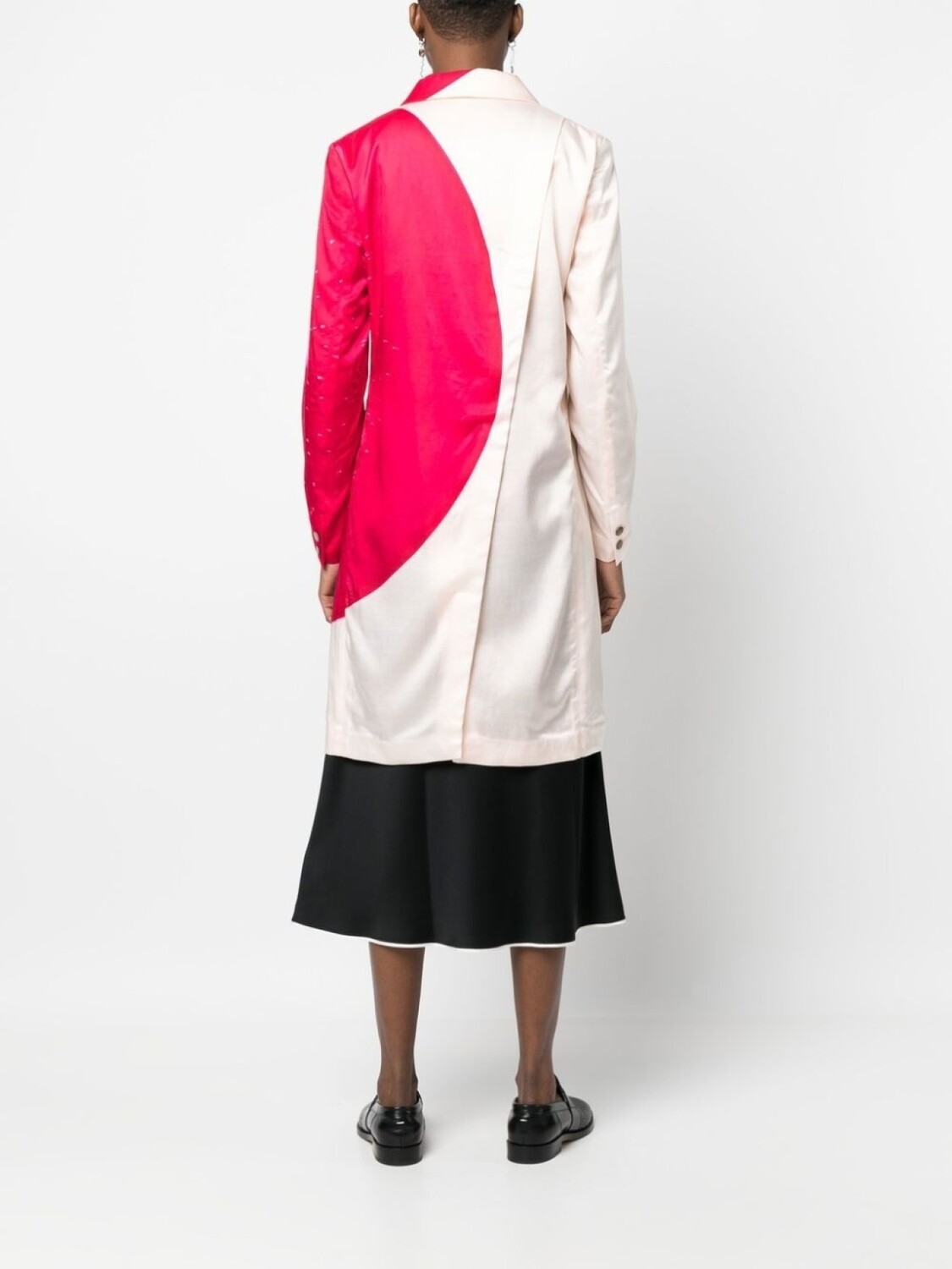Ярко-розовый, кремовый, асимметричная форма, классические лацканы, застежка на пуговицах спереди, длинные рукава, два передних кармана с клапанами и шлица по центру сзади.