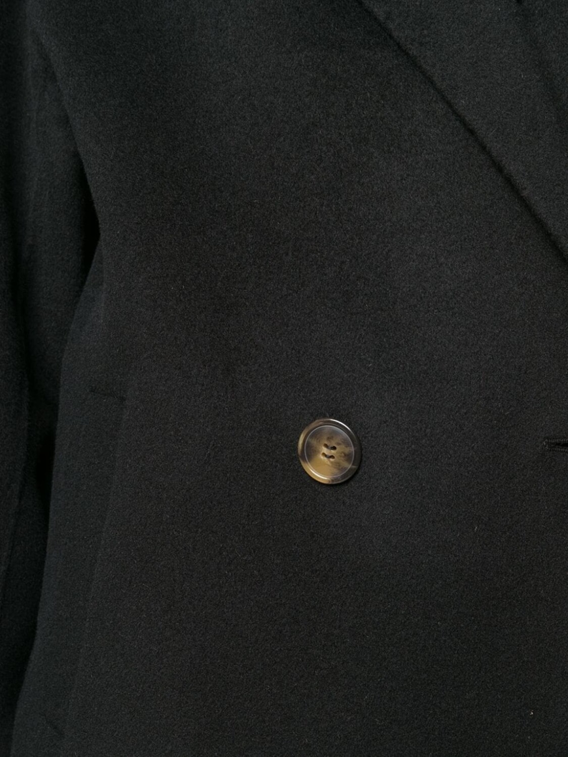 Зазубренные лацканы, двубортная застежка на пуговицы, длинные рукава, два передних кармана с листочкой и длина до середины голени. Цвет: черный.