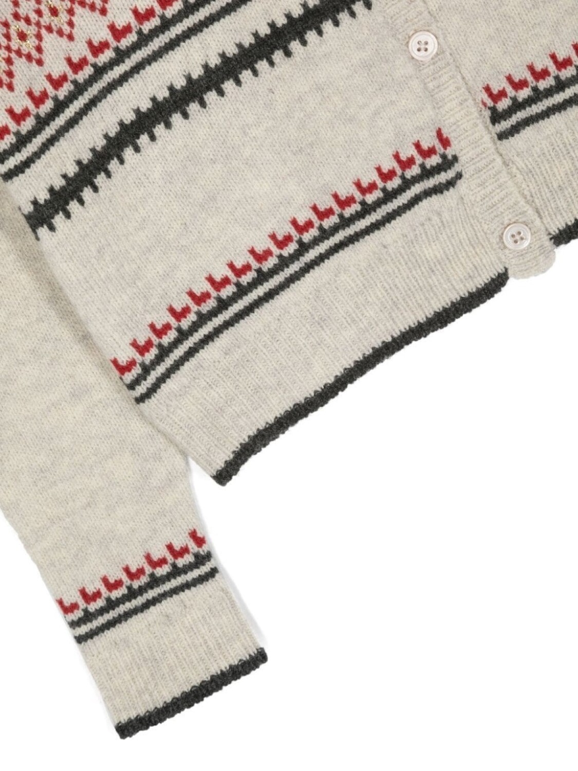 Серый, смесовая шерсть, вязка в технике интарсия, геометричный принт, круглый вырез, застежка на пуговицах спереди и длинные рукава.