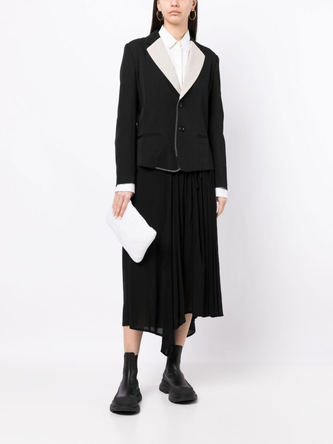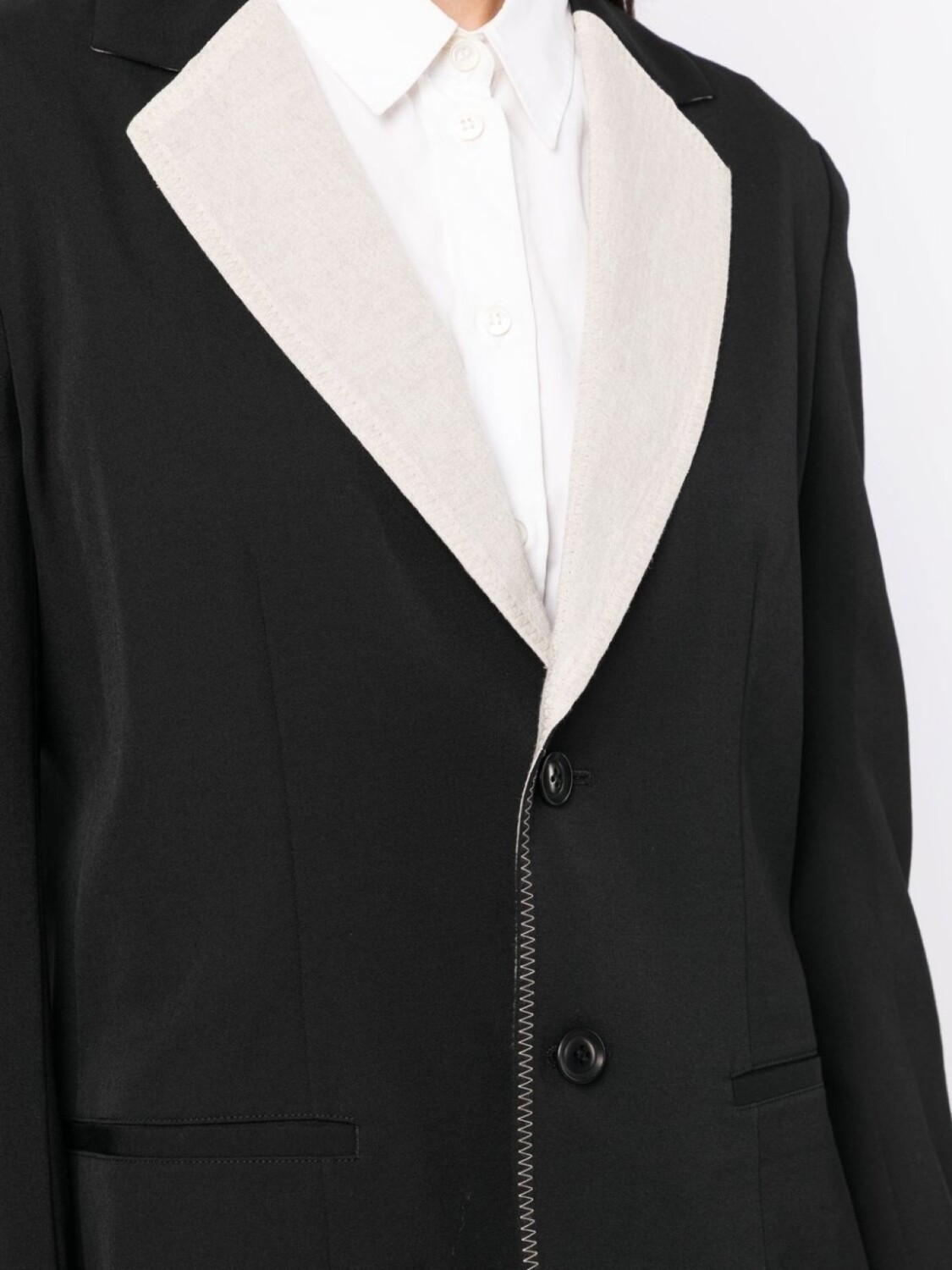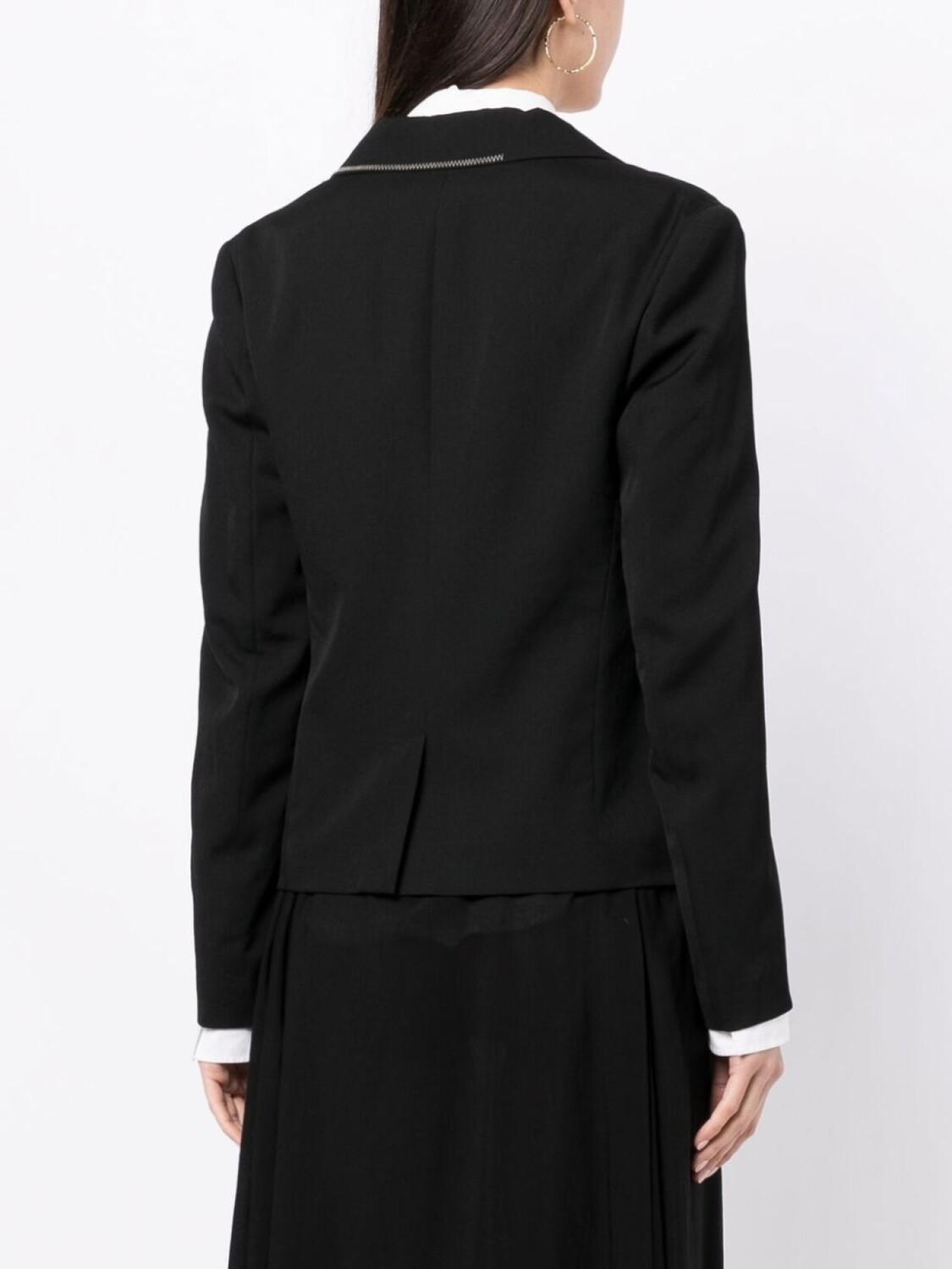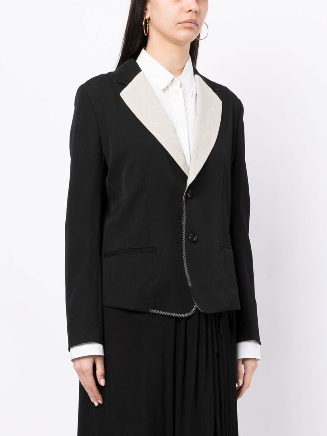 Строгий крой, застежка на пуговицах спереди, контрастные лацканы, два передних кармана с листочкой и вырез сзади.