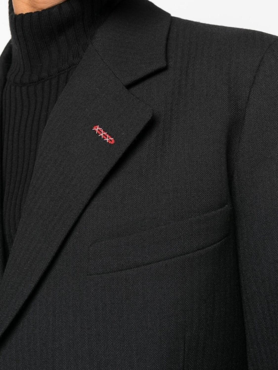Черный, смесовая шерсть, нашивка с логотипом, узор в вертикальную полоску, зазубренные лацканы, застежка на пуговицах спереди, передние карманы с клапаном и длинные рукава.