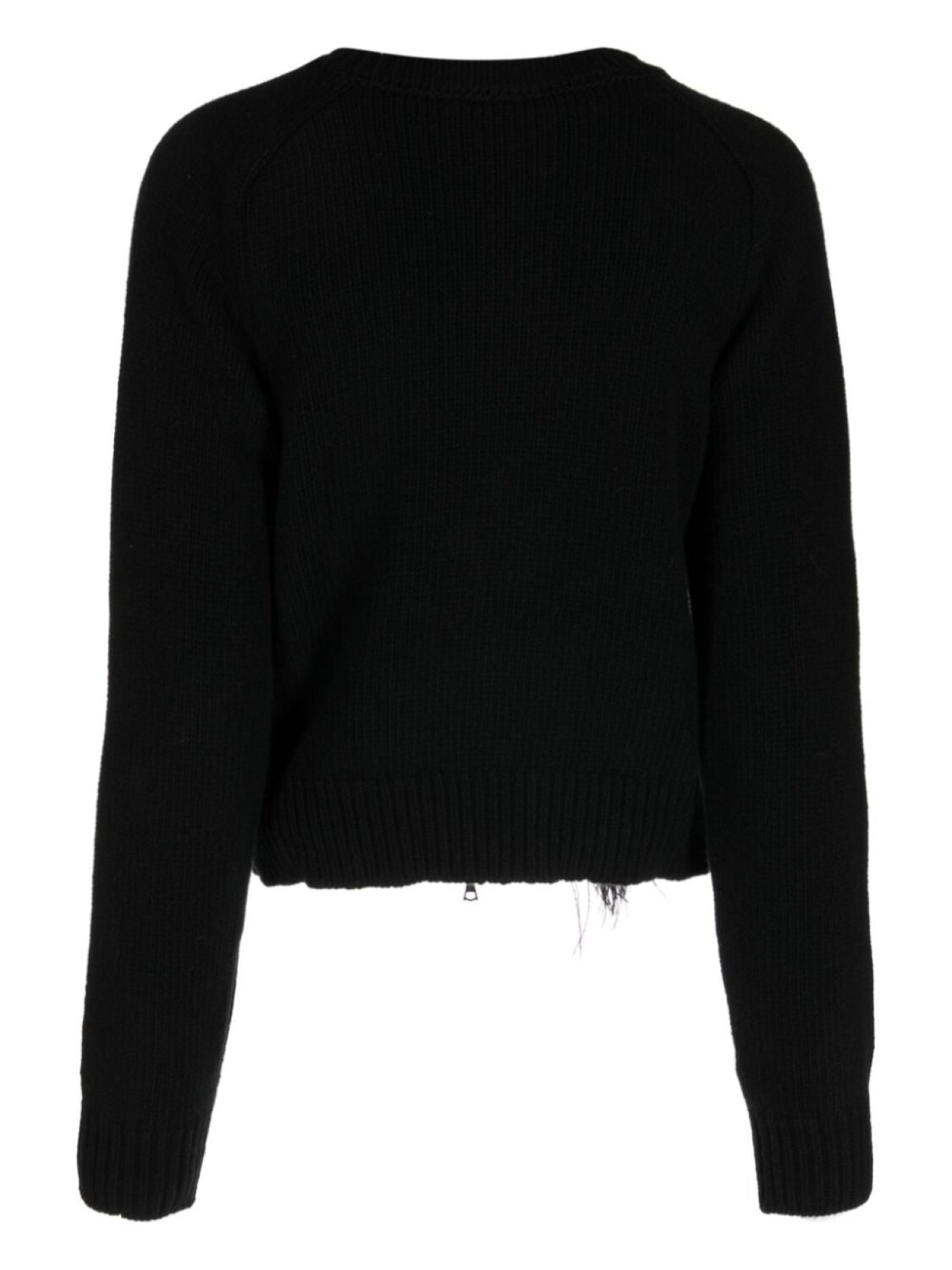 Черный, шерсть, трикотажный материал, отделка в рубчик, декор из кристаллов, широкое горлышко, застежка на молнии спереди, длинные рукава и прямой подол.