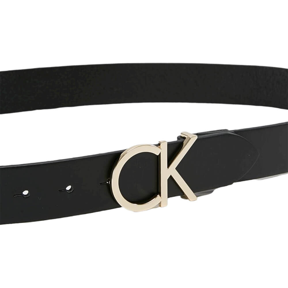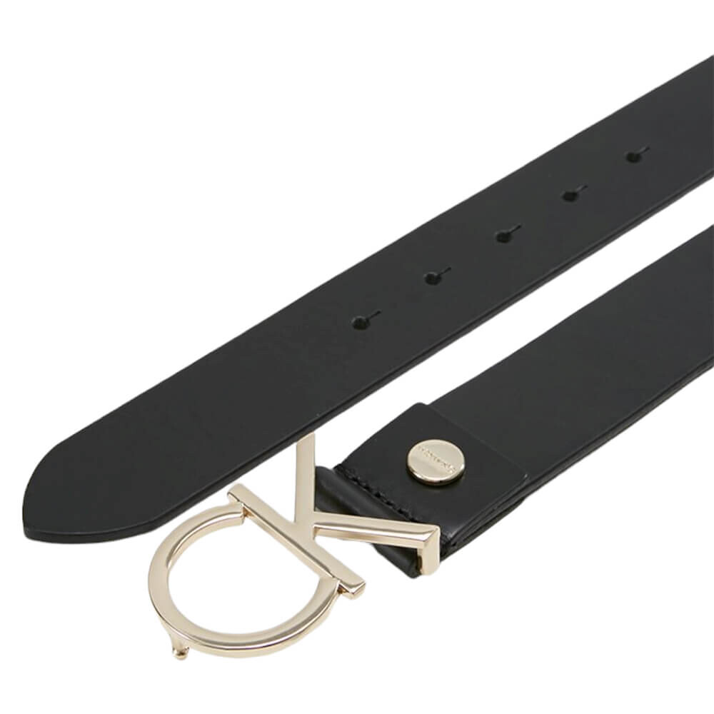 Ремень от бренда Calvin Klein из натуральной кожи черного цвета и фирменной золотой пряжкой с монограммой. Регулируемая длина ремня.