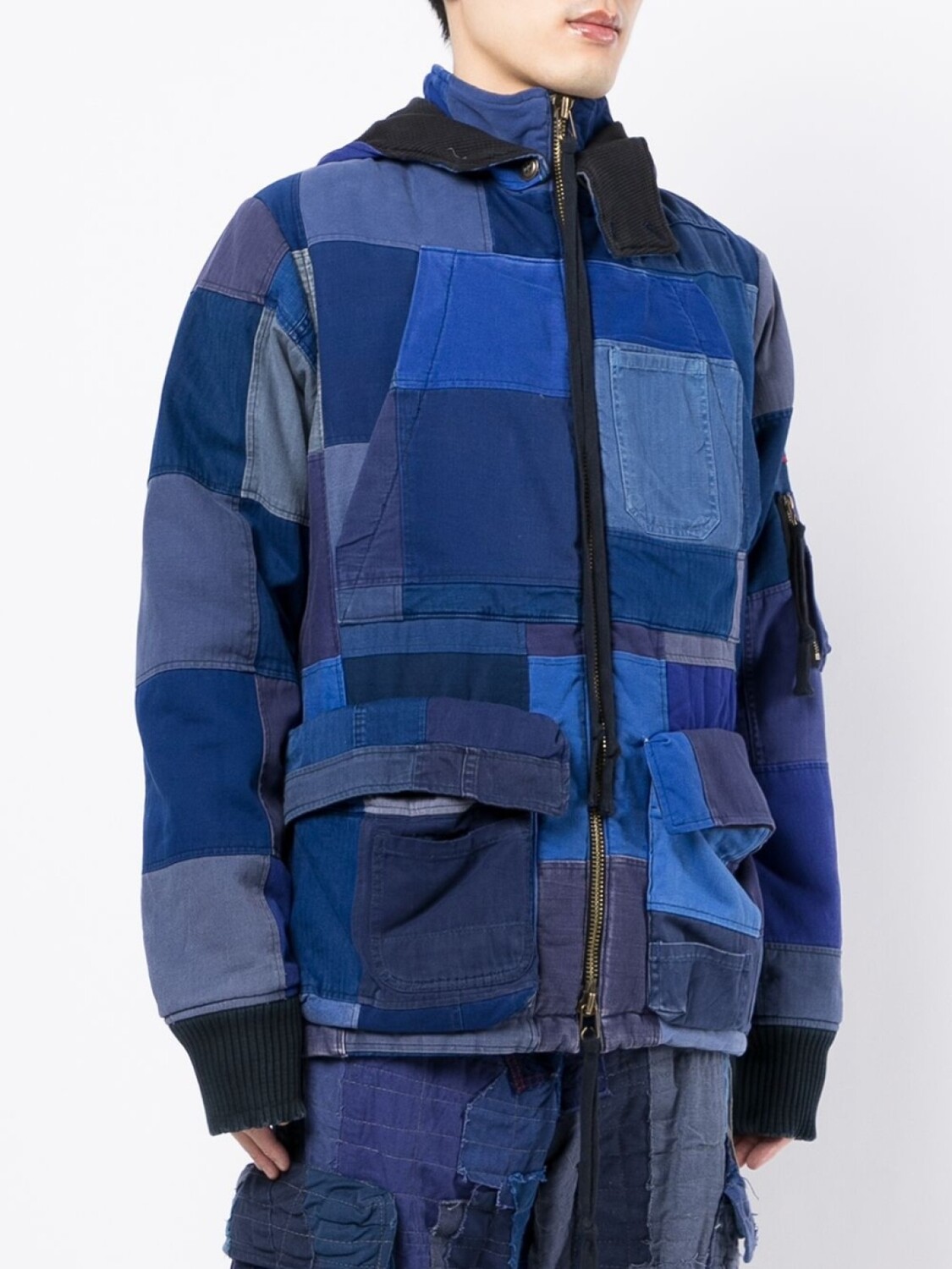 Техника пэчворк, косой воротник, застежка на молнии спереди, длинные рукава, карман с молнией на рукаве и два передних кармана с клапанами. Цвет: синий.