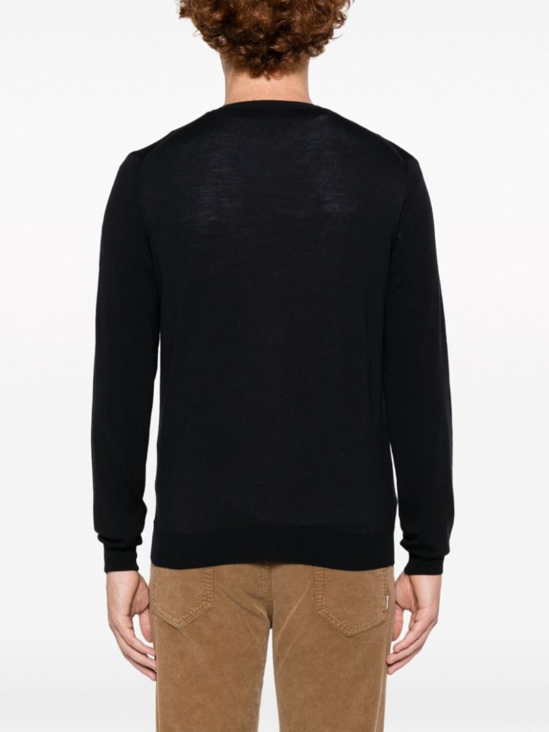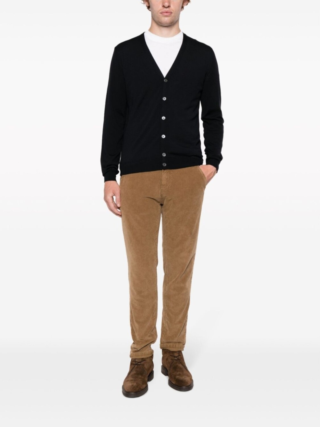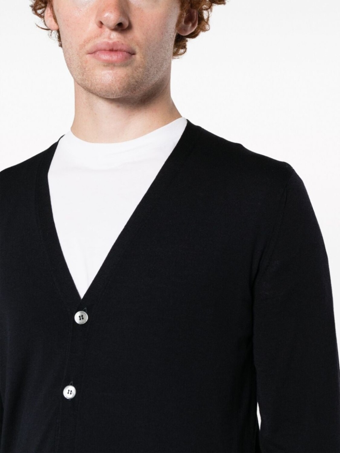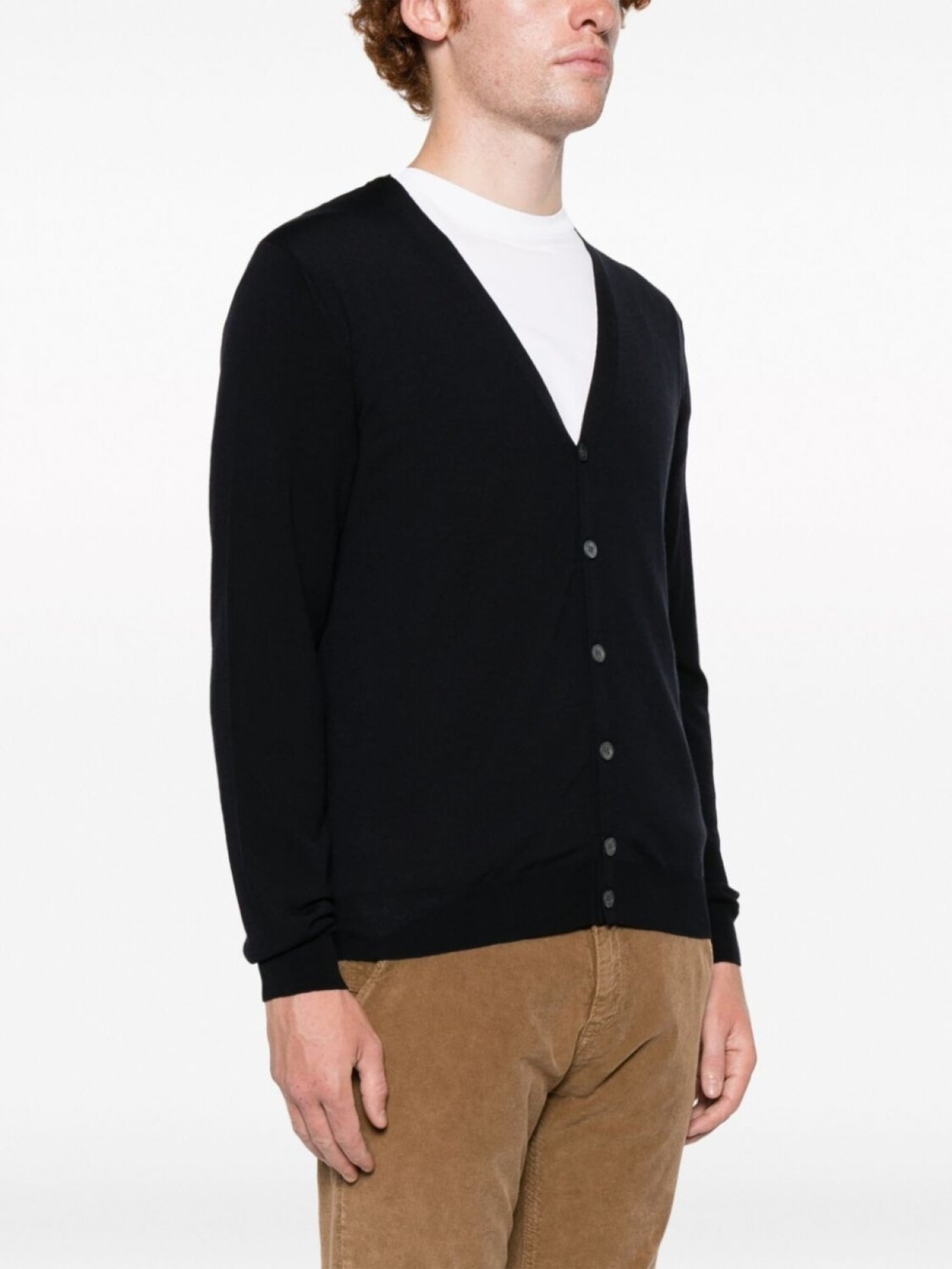 Темно-синий, смесовая необработанная шерсть, тонкая вязка, глубокий V-образный вырез, застежка на пуговицах спереди, длинные рукава и прямой подол.