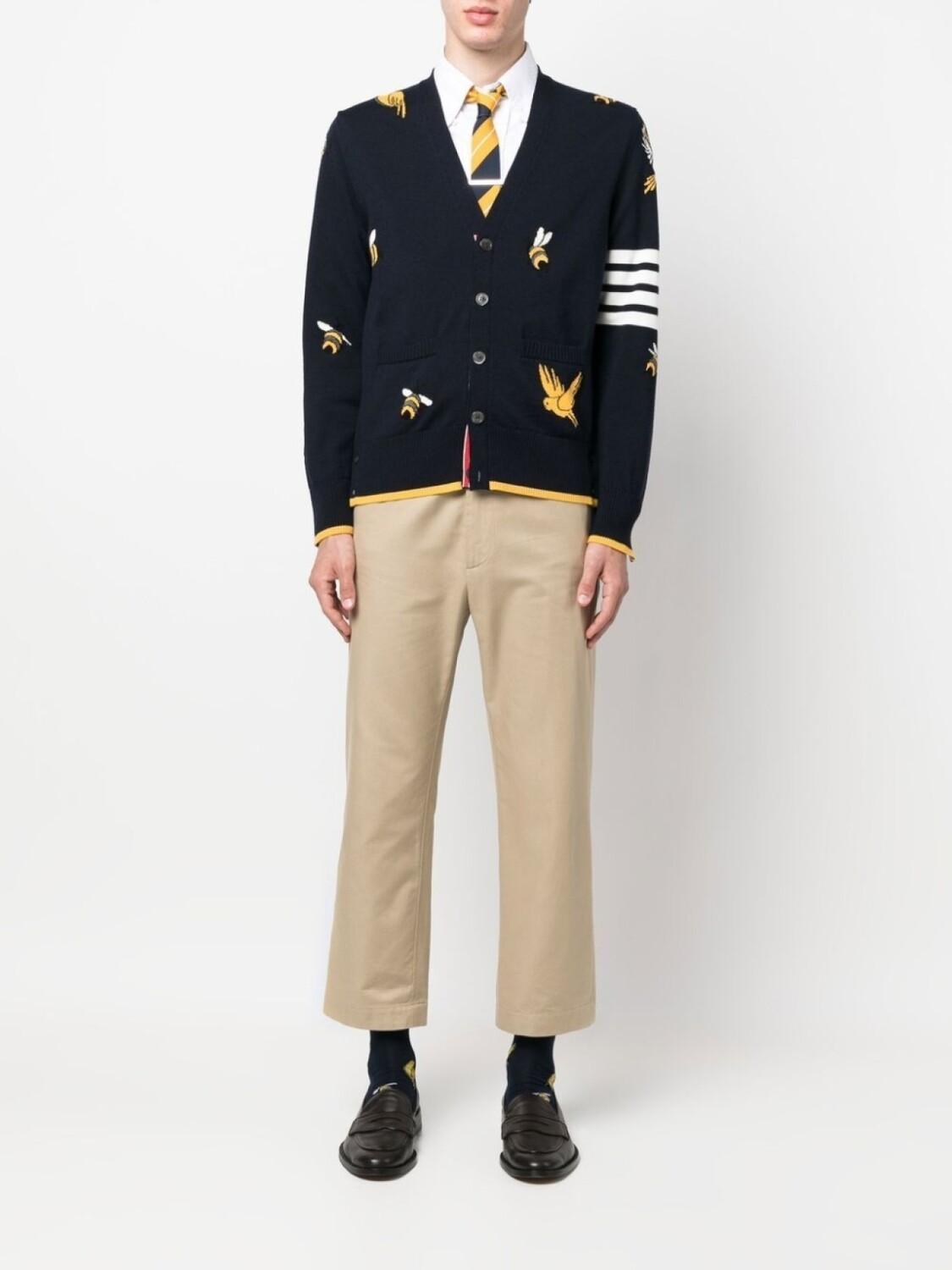 Темно-синий, разноцветный, смесь хлопка и шерсти, полоски 4-Bar, знаковая деталь в полоску, знаковый декор в виде триколора, вязка в технике интарсия, V-образный вырез, застежка на пуговицах спереди, два накладных кармана спереди, длинные рукава, прямой подол и отделка в рубчик.