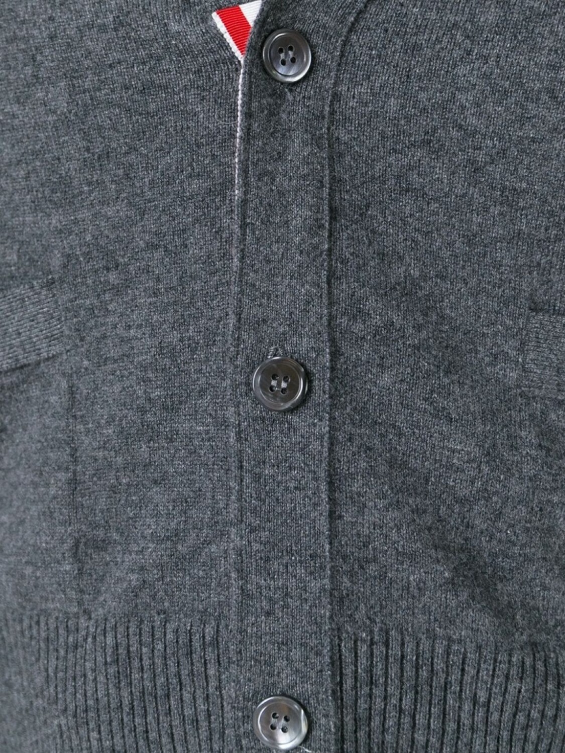 Серый кашемировый кардиган с полосками на рукаве от Thom Browne.