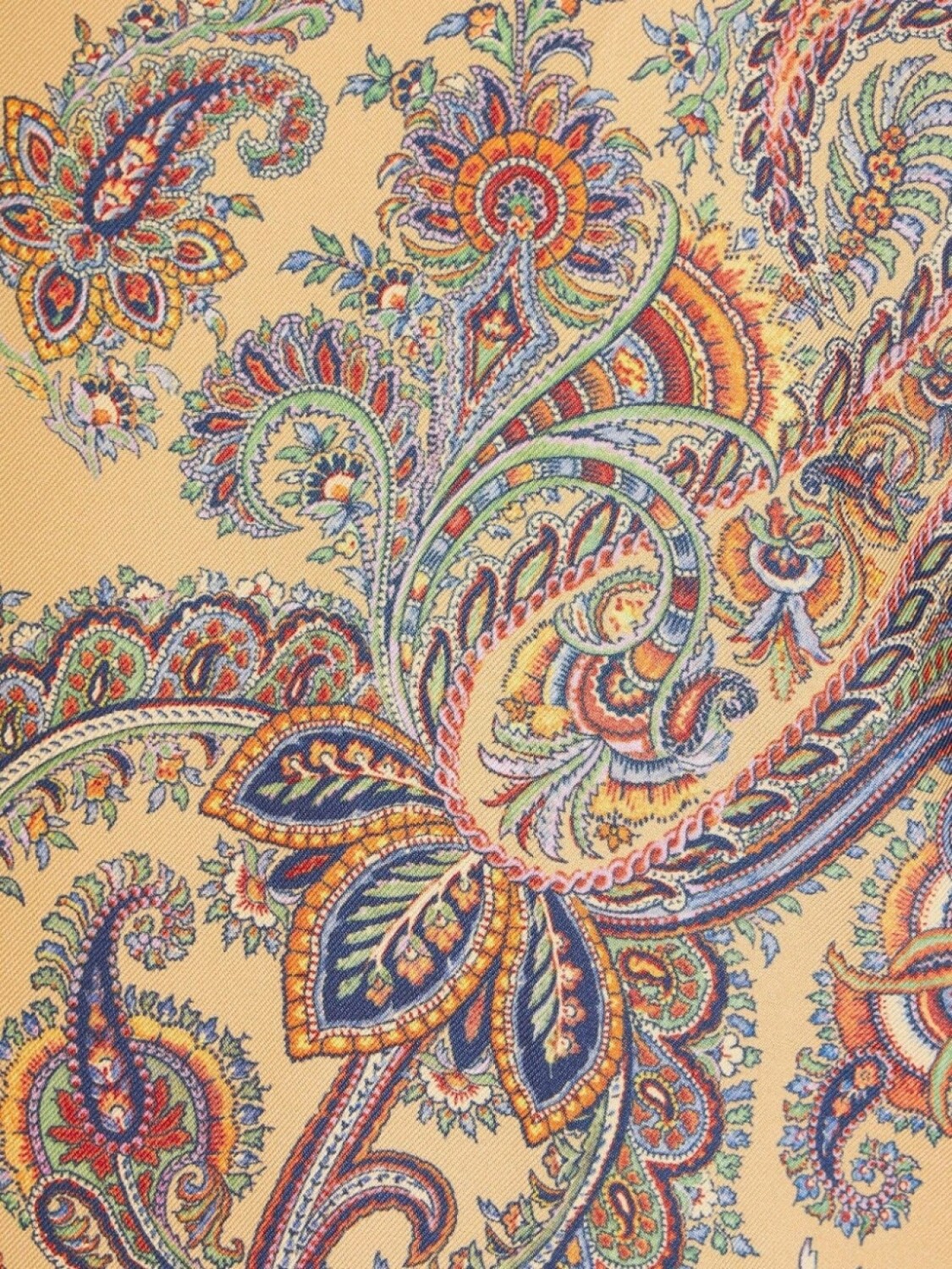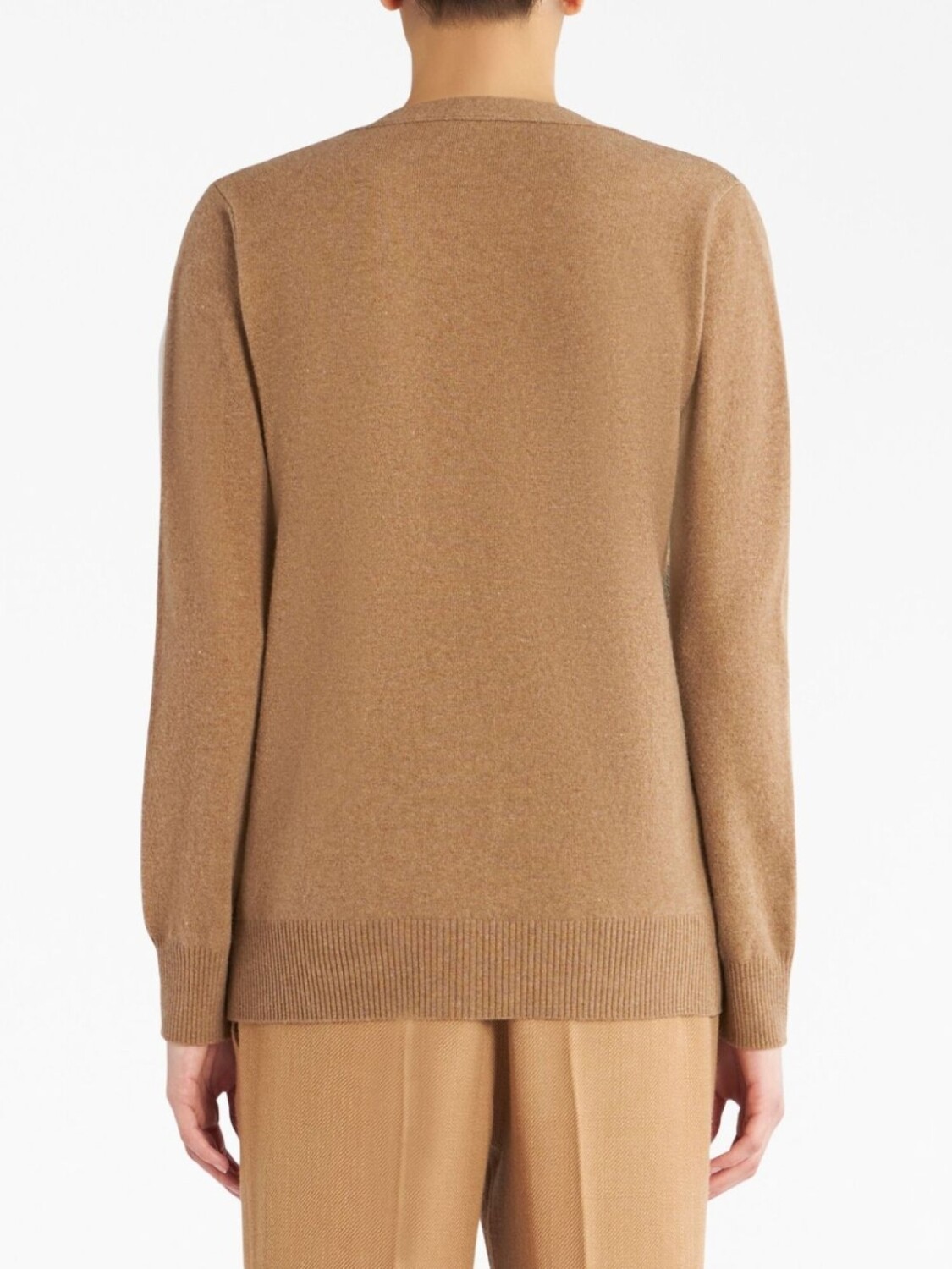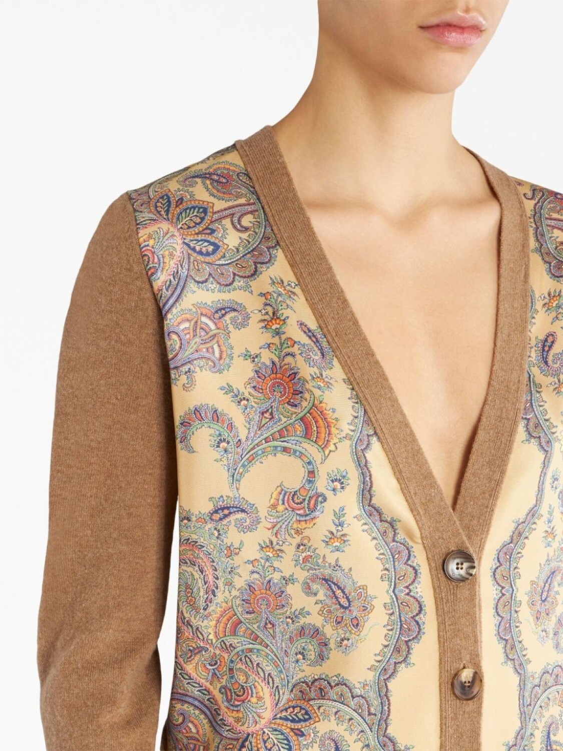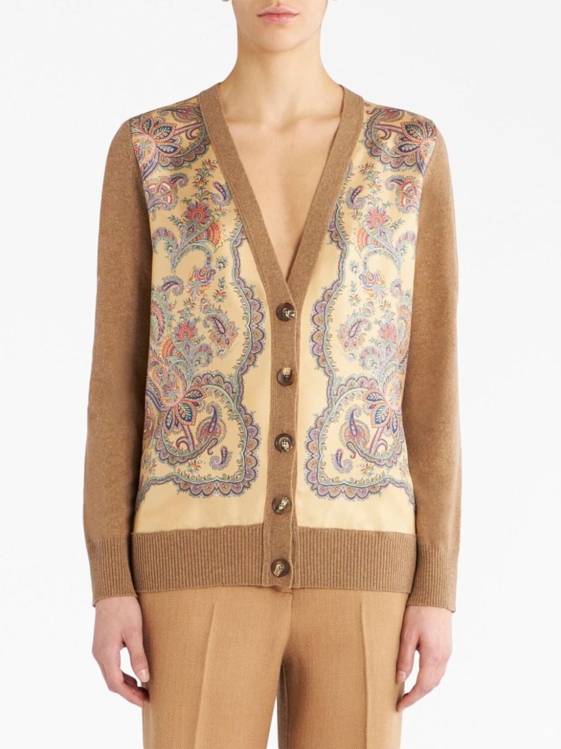 Бежевый, смесовая шерсть, трикотажный материал, отделка в рубчик, принт пейсли, вставки, V-образный вырез, застежка на пуговицах спереди, длинные рукава и прямой подол.