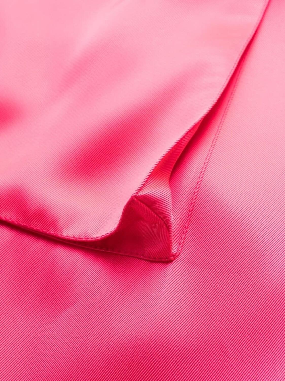 Кораллово-розовый, завышенная талия, потайная застежка спереди, петли для ремня, два накладных кармана по бокам, карман на молнии сзади и широкий крой.