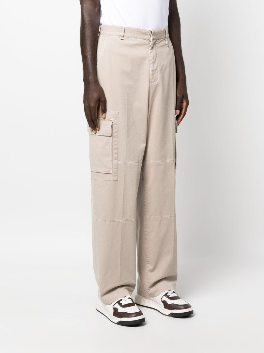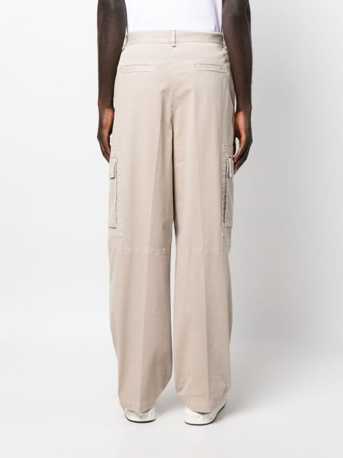 Песочно-бежевый, эластичный хлопок, нашивка с логотипом сбоку, крепление для ключей, петли для ремня, потайная застежка спереди, два прорезных кармана по бокам, два накладных кармана по бокам, два прорезных кармана сзади и широкий крой.
