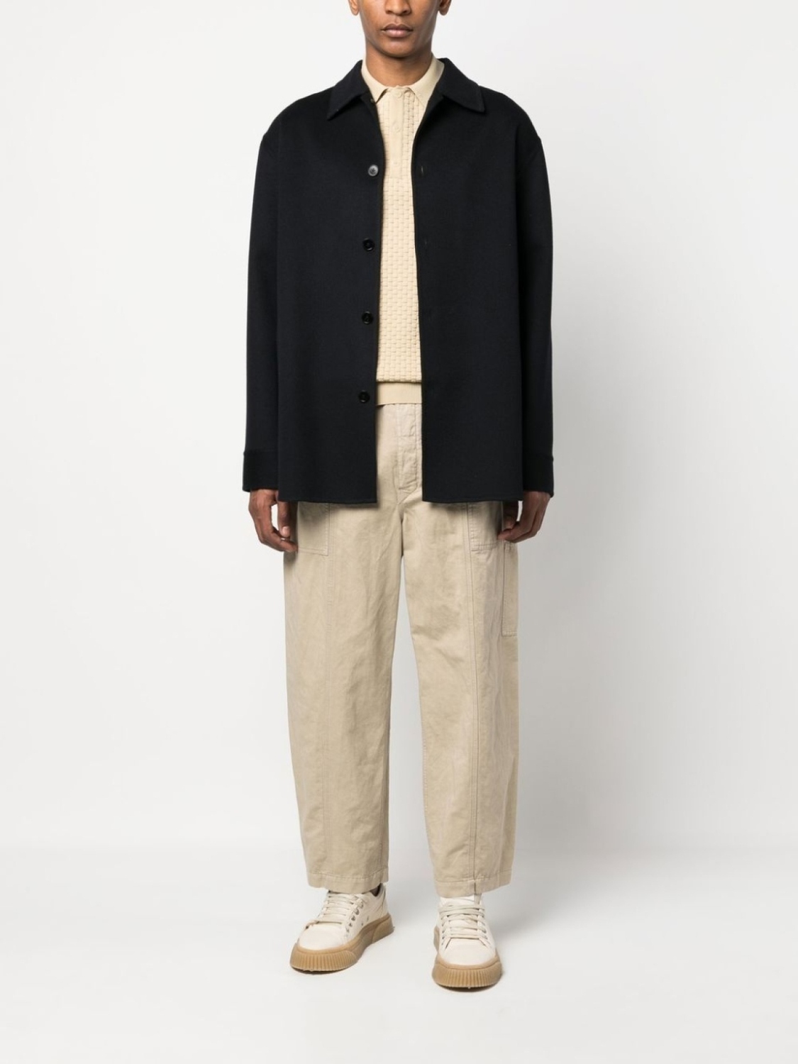 Темно-синий, кашемир, отложной воротник, застежка на пуговицах спереди, длинные рукава, манжеты на пуговицах и закругленный подол.
