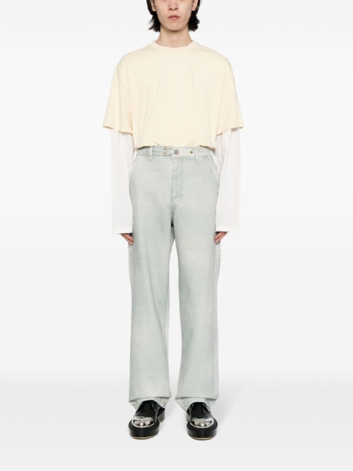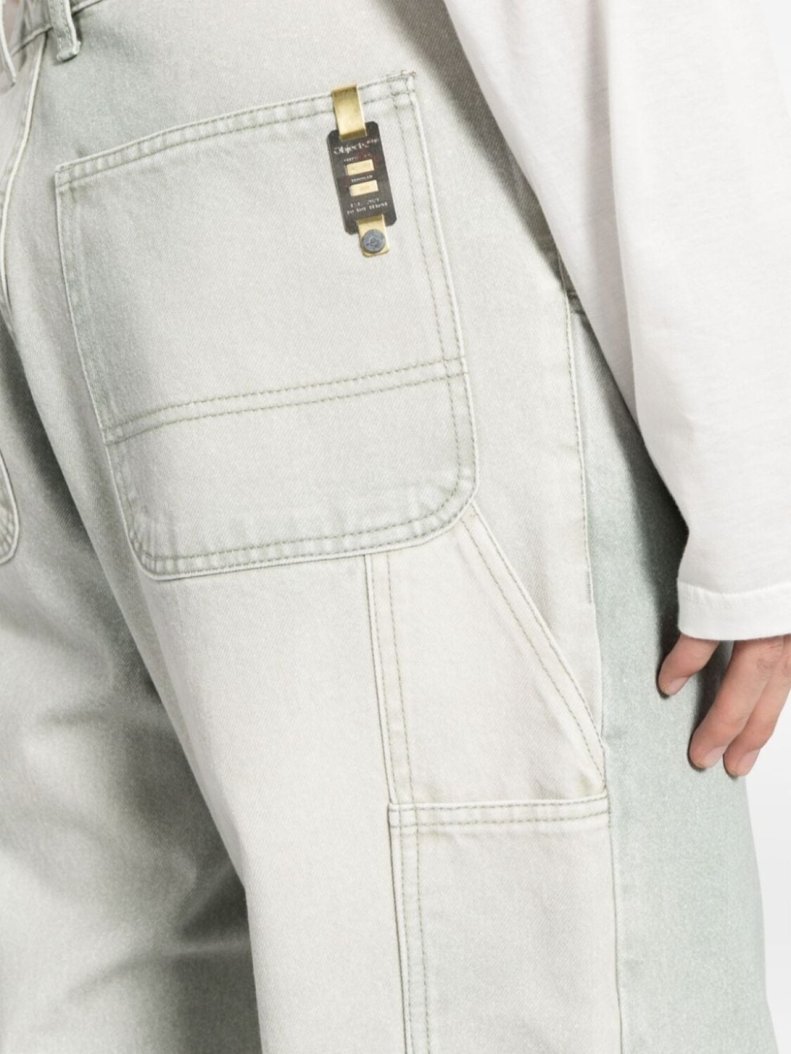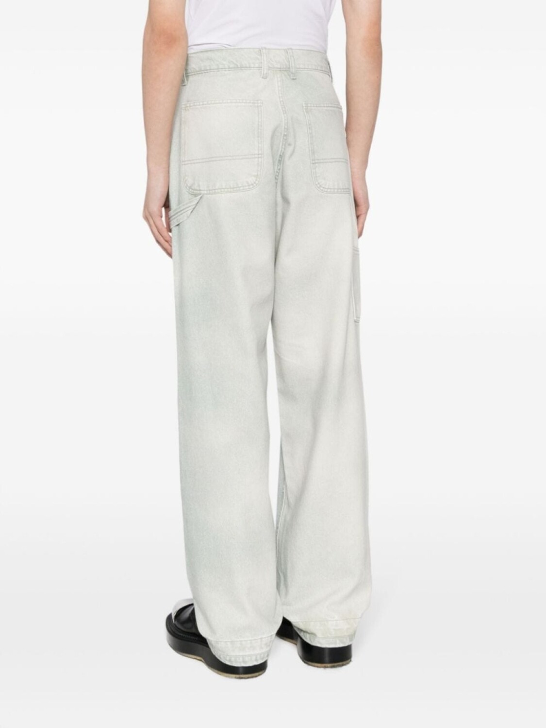 Светло-зеленый, хлопок, деним, логотип-аппликация, ремешки, завышенная талия, потайная застежка на молнии и пуговицах, петли для ремня, два прорезных кармана по бокам, два накладных кармана сзади, широкий крой и прямой подол.