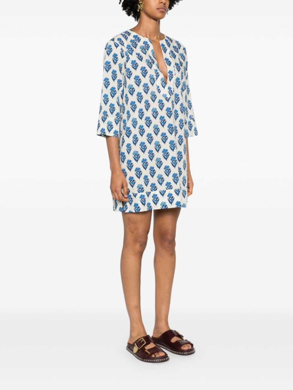 Белый/синий хлопок цвета слоновой кости, сплошной цветочный принт, круглый вырез с разрезом, рукава длиной три четверти, короткие боковые разрезы без подкладки, прямой подол, длина до бедра