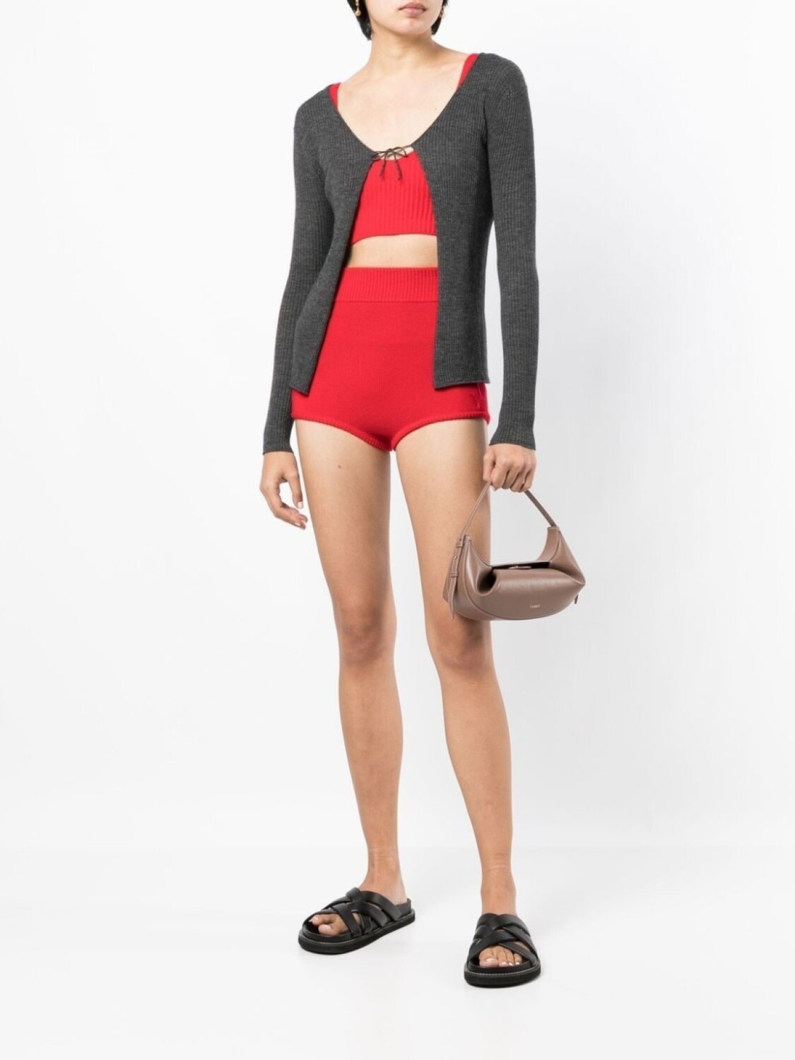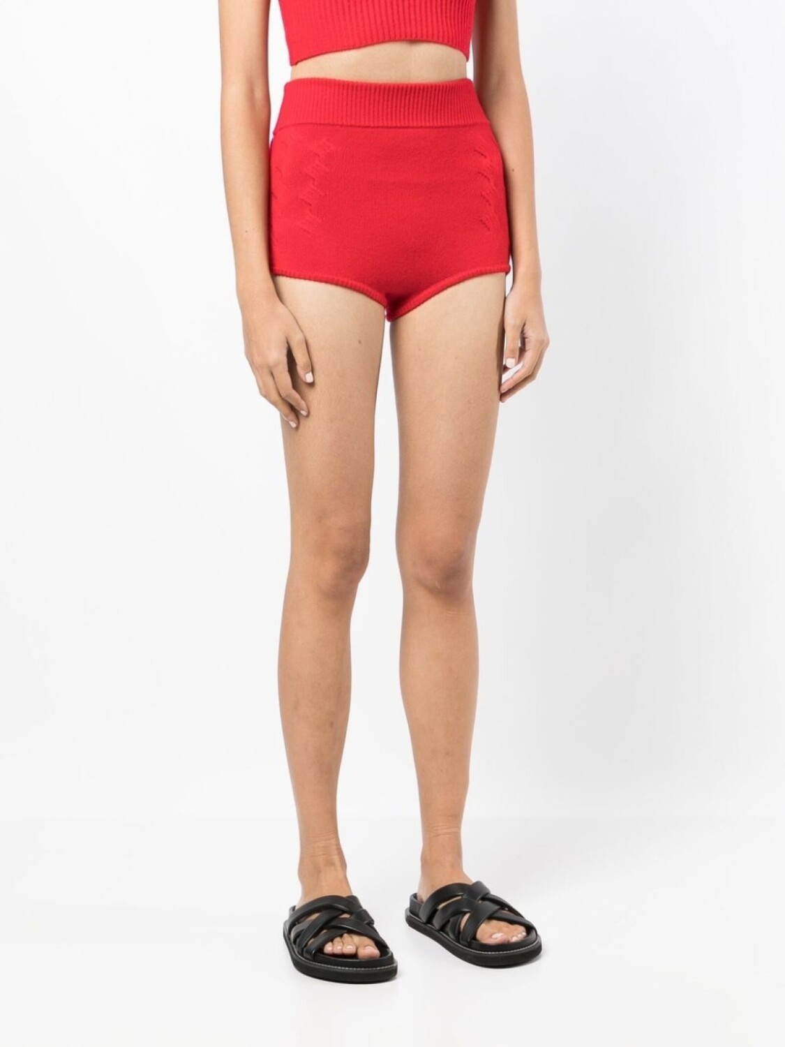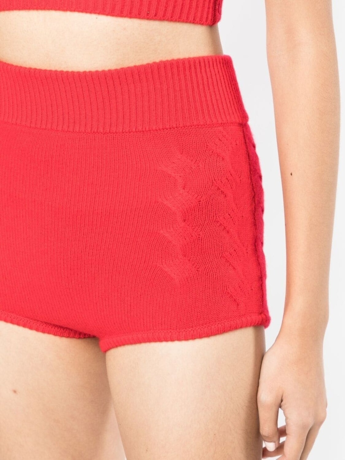 Ярко-красный, смесь шерсти и кашемира, фактурная вязка, пояс в рубчик и завышенная талия.