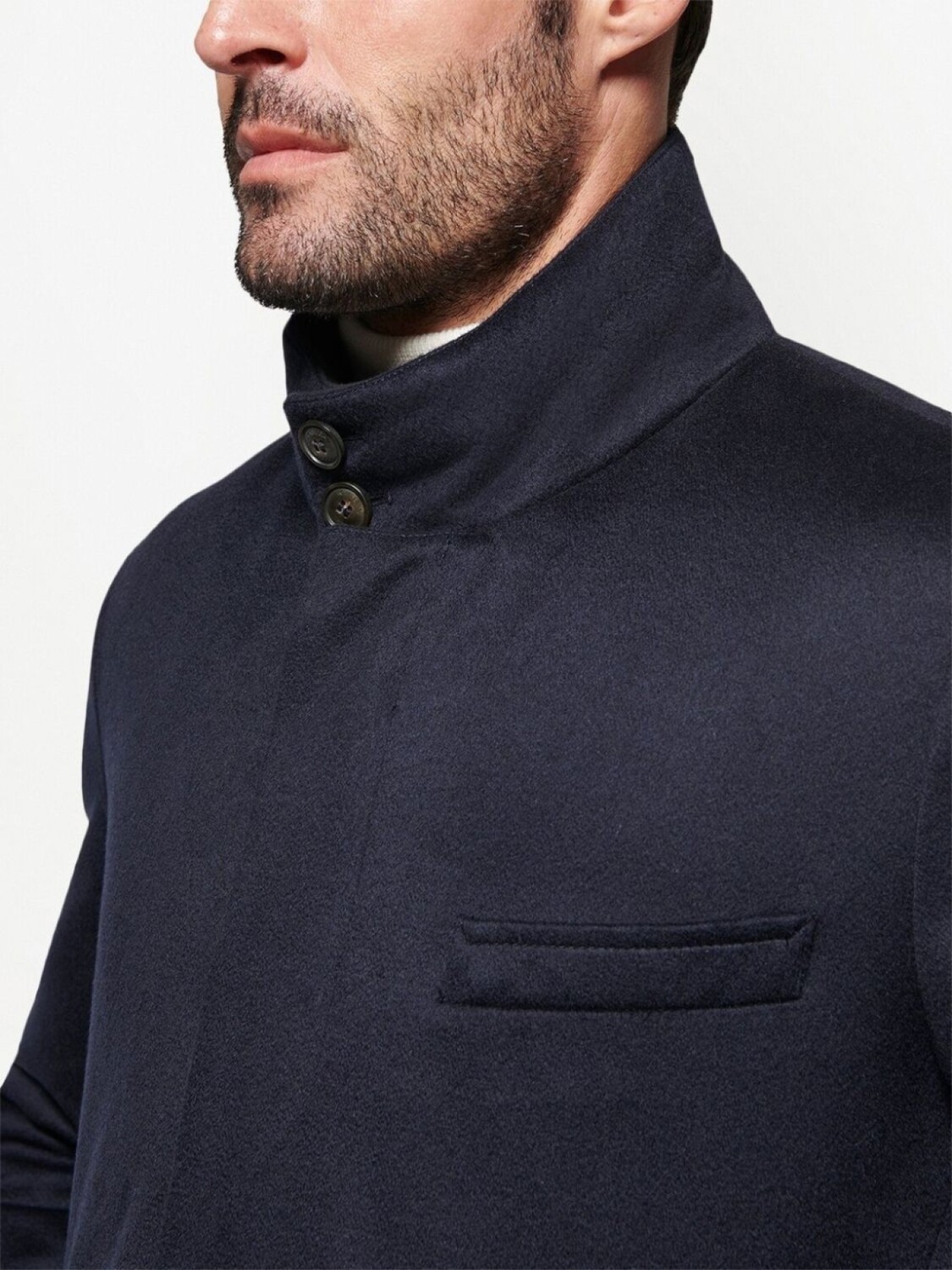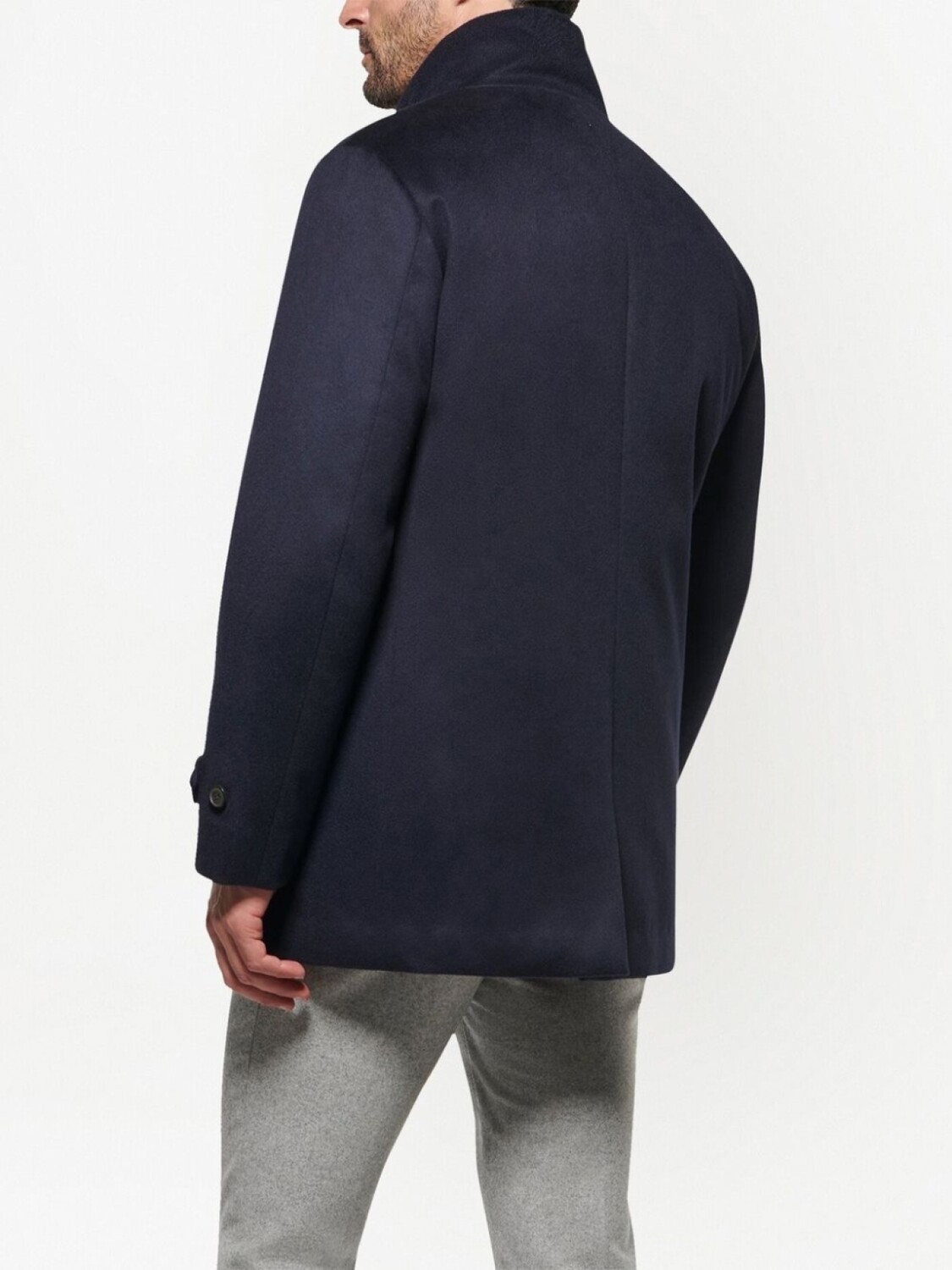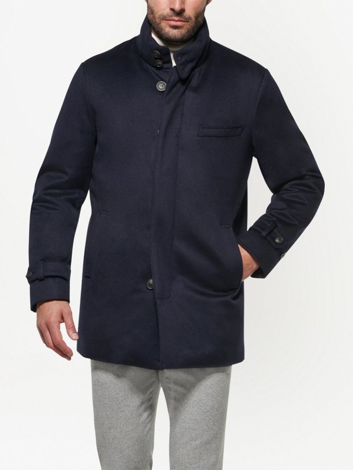 Темно-синий, кашемир, утиные перья, подкладка из джерси, высокий воротник, застежка на пуговицах спереди, прорезной карман на груди, два прорезных кармана по бокам, внутренний карман на молнии, длинные рукава и прямой подол.