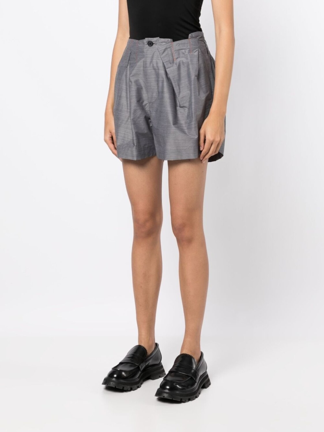 Серый, асимметричная форма, контрастная строчка, складки, петли для ремня, завышенная талия, застежка на пуговицах спереди, два кармана с листочкой сзади и длина до бедер.