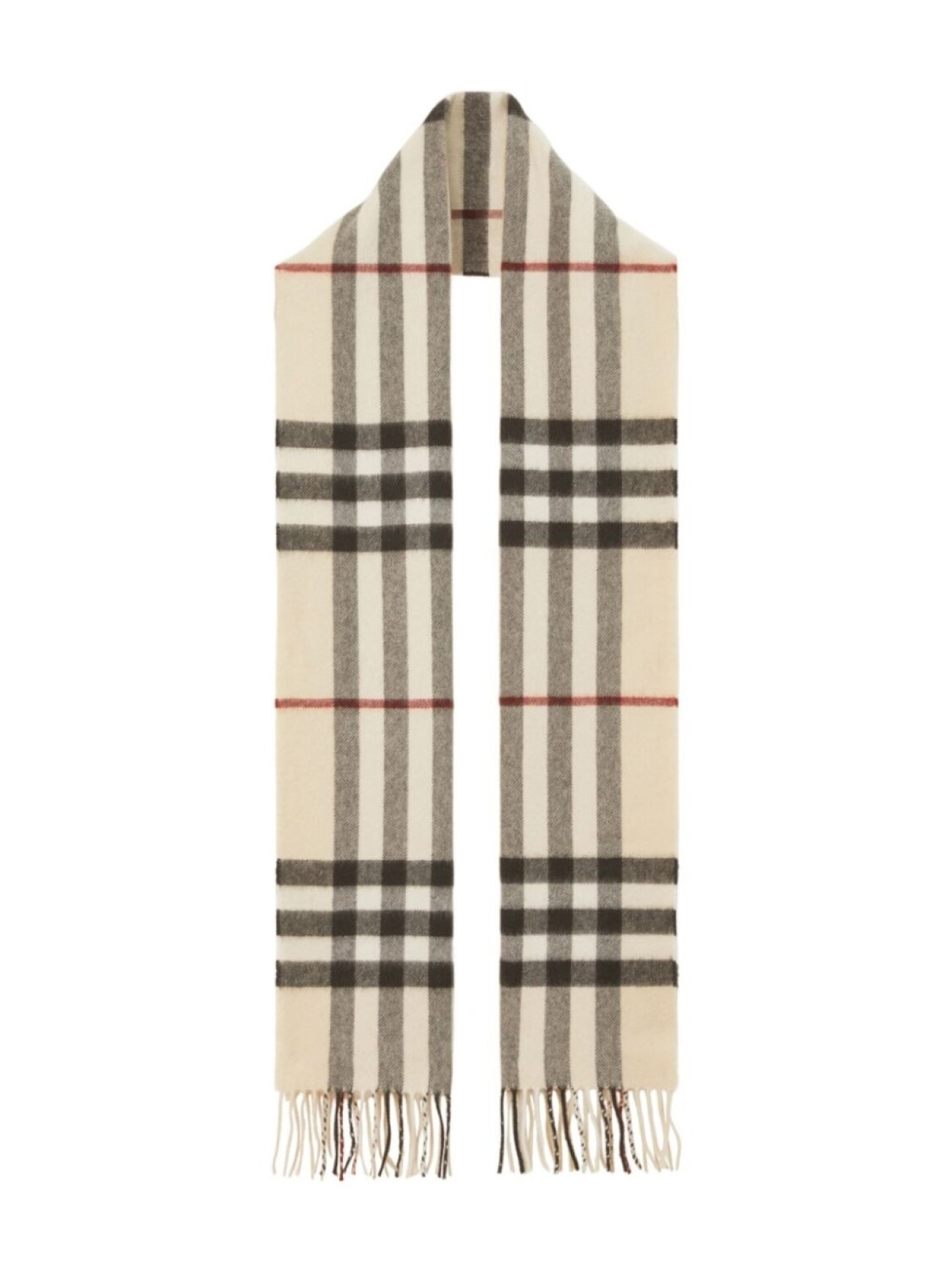 Бежевый, разноцветный, кашемир, трикотажный материал, клетчатый принт Vintage Check, несколько оборотов и необработанные края.