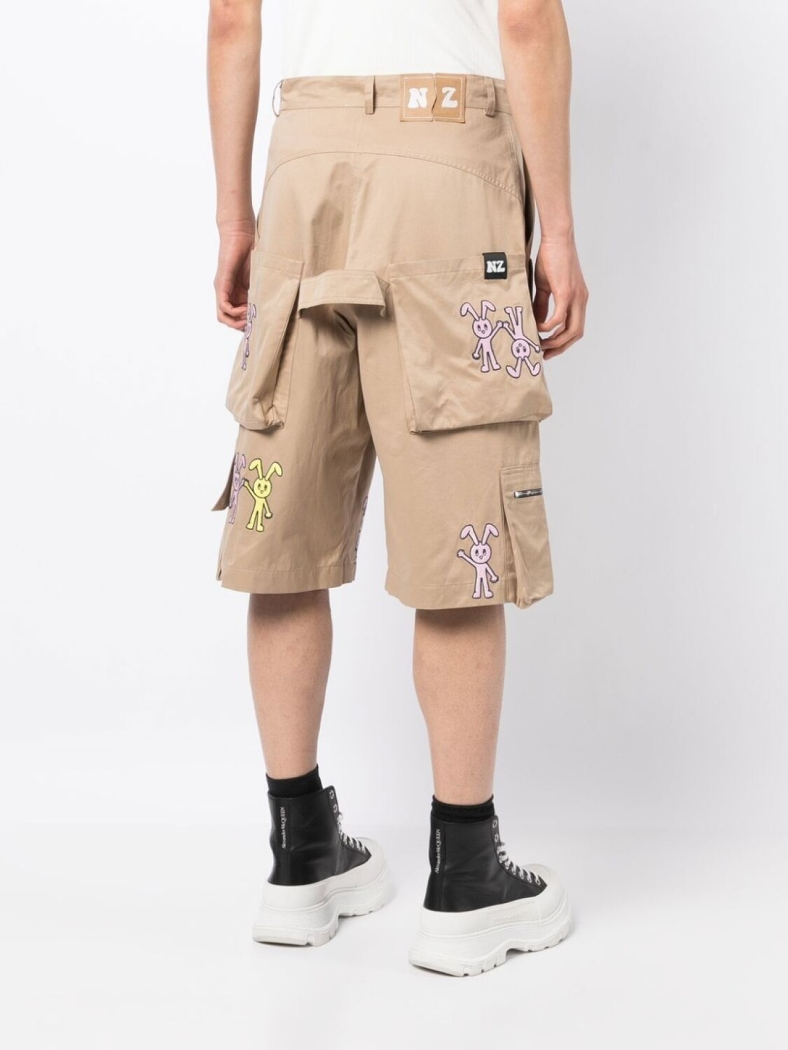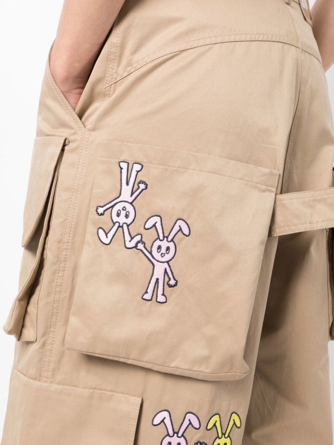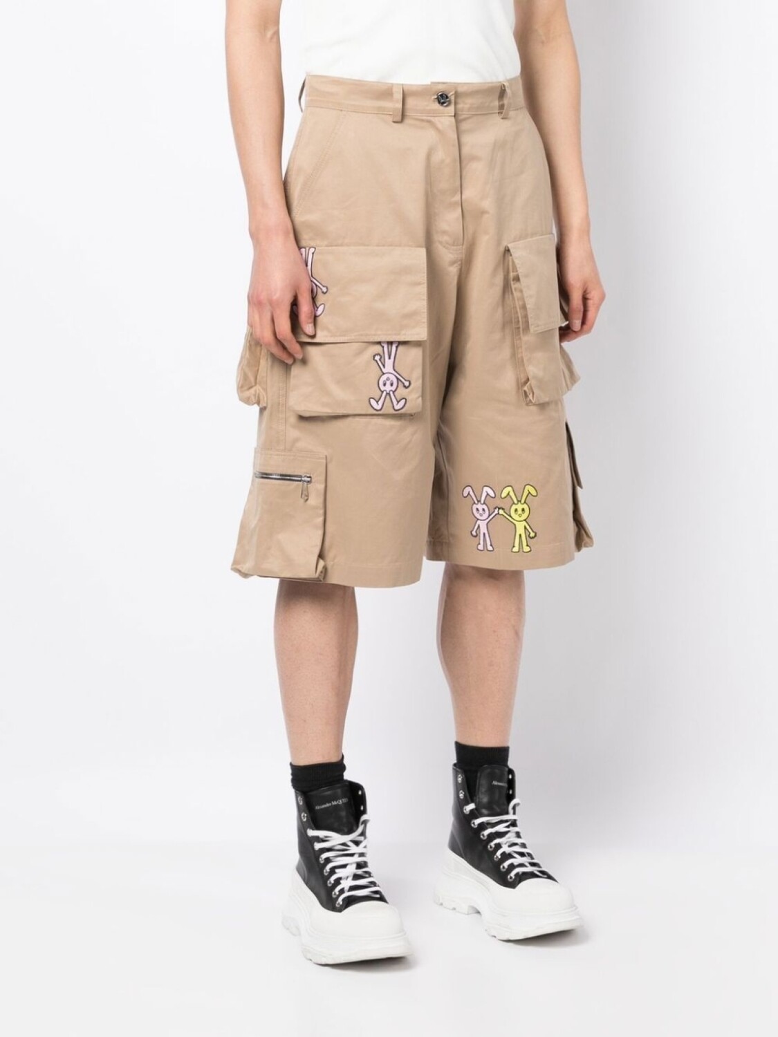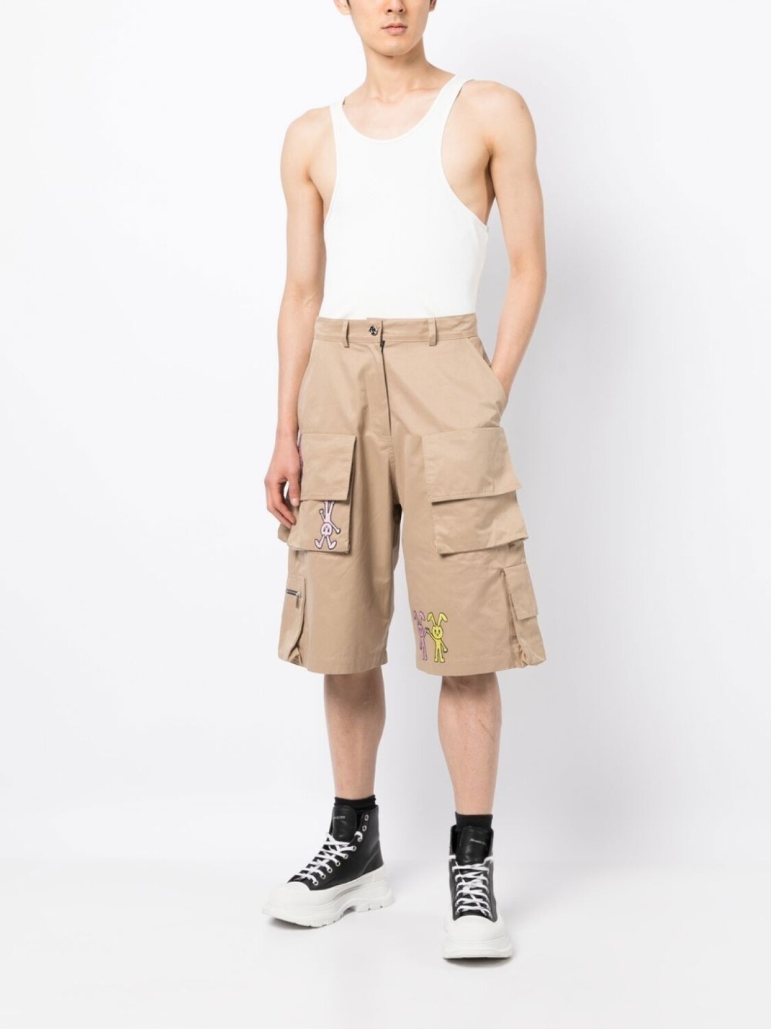 Бежевый, эластичный хлопок, нашивка с логотипом сзади, принт-иллюстрация, петли для ремня, застежка на молнии и пуговице спереди, два прорезных кармана по бокам, два передних кармана с клапанами, два накладных кармана сзади и длина по колено.