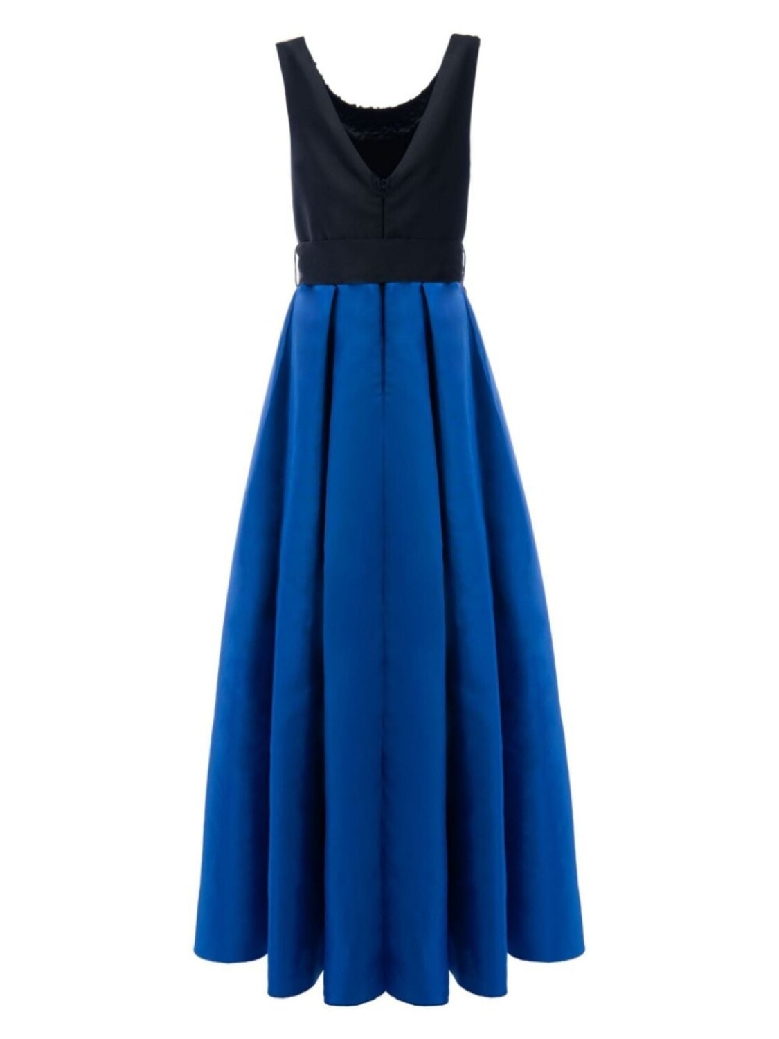 Черный/синий, сатиновая фактура, дизайн колор-блок, отделка стразами, круглый вырез, застежка на молнии сзади, без рукавов, V-образный вырез, приталенный силуэт, плиссированная юбка, длина в пол