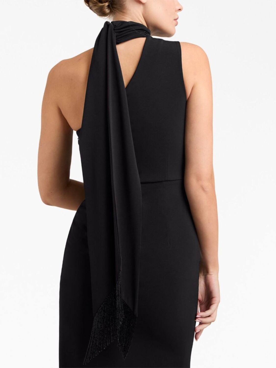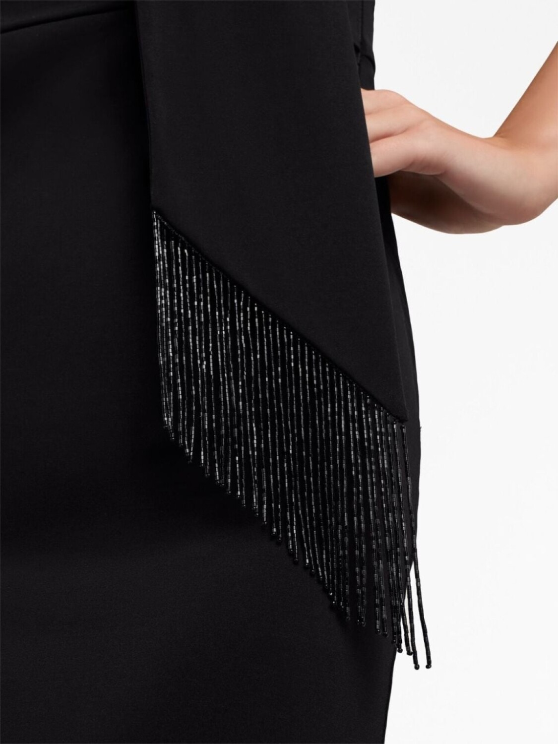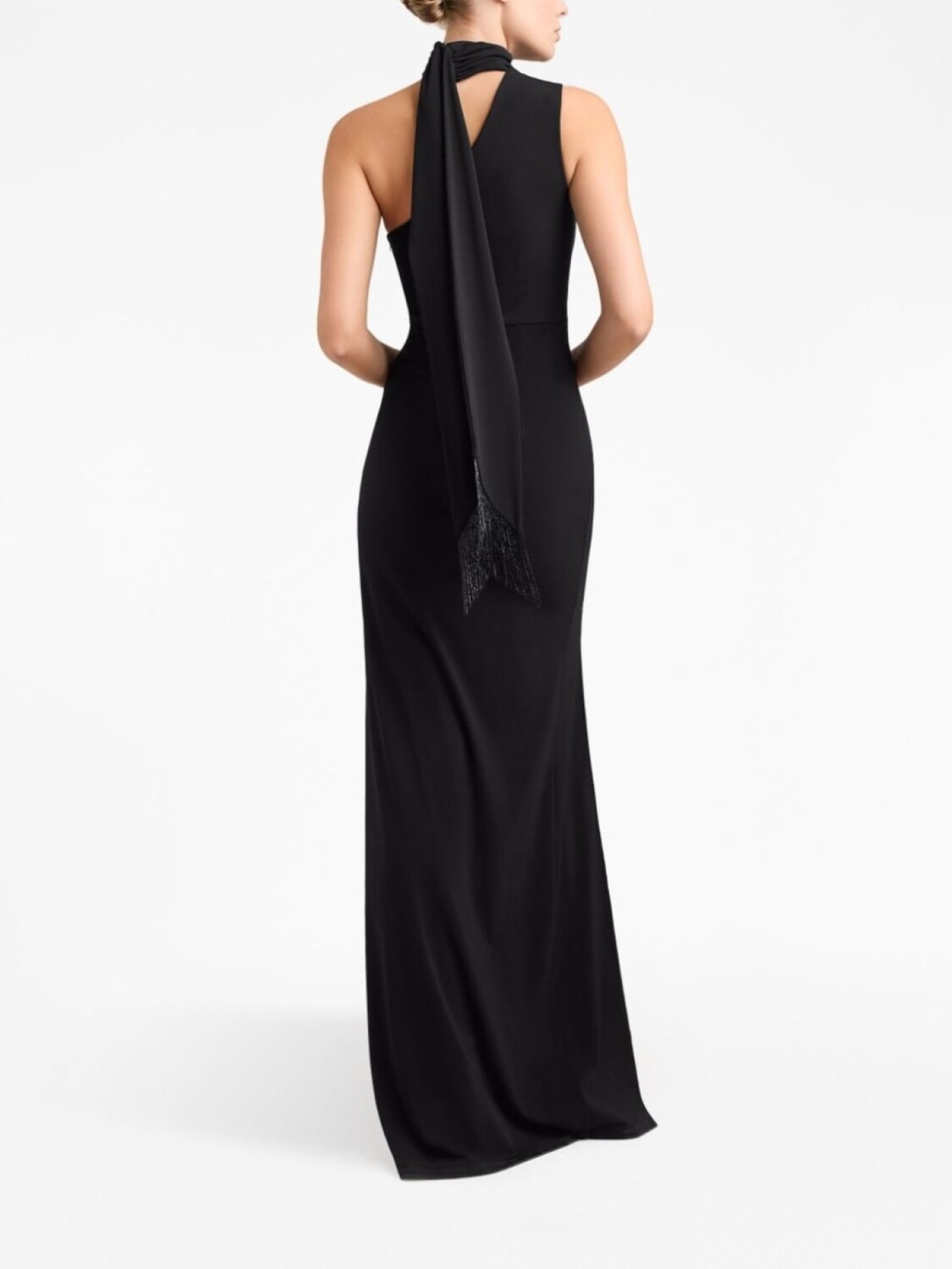 Черный, декоративный шарф, модель на одном плече, без рукавов, приталенный силуэт, разрез спереди и длина макси.
