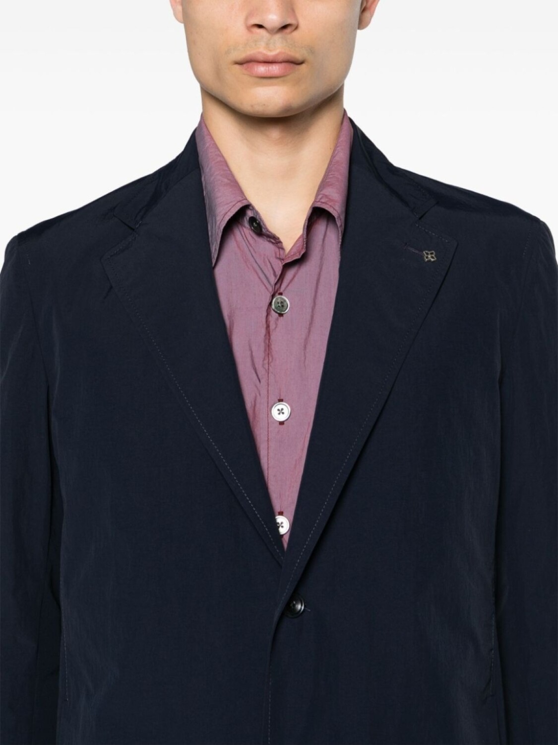 Темно-синяя ракушка, брошь с жатой отделкой, зубчатые лацканы, застежка на пуговицы спереди, длинные рукава, манжеты на пуговицах, два боковых прорезных кармана, итальянские шлицы сзади, прямой подол