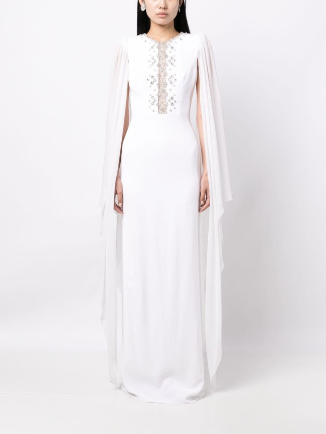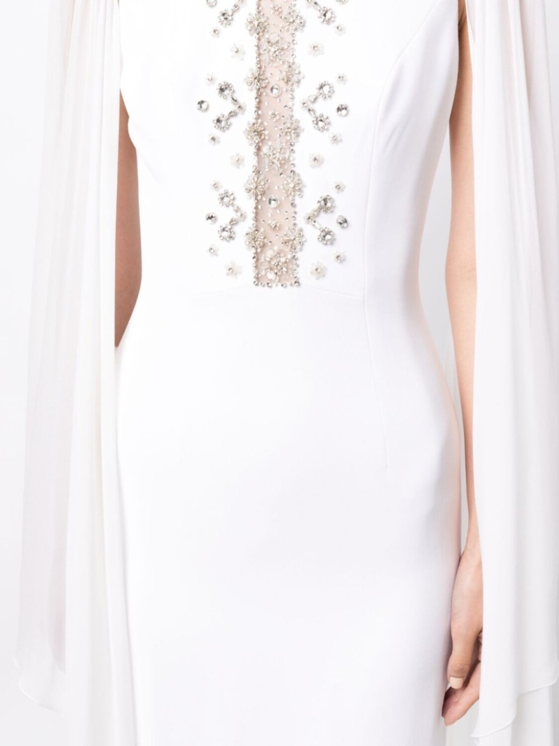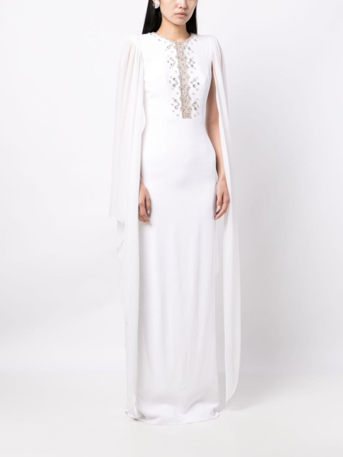 Белый, декор из кристаллов, кейп, круглый вырез, потайная застежка сзади, вырез сзади, расклешенный подол и длинная модель.