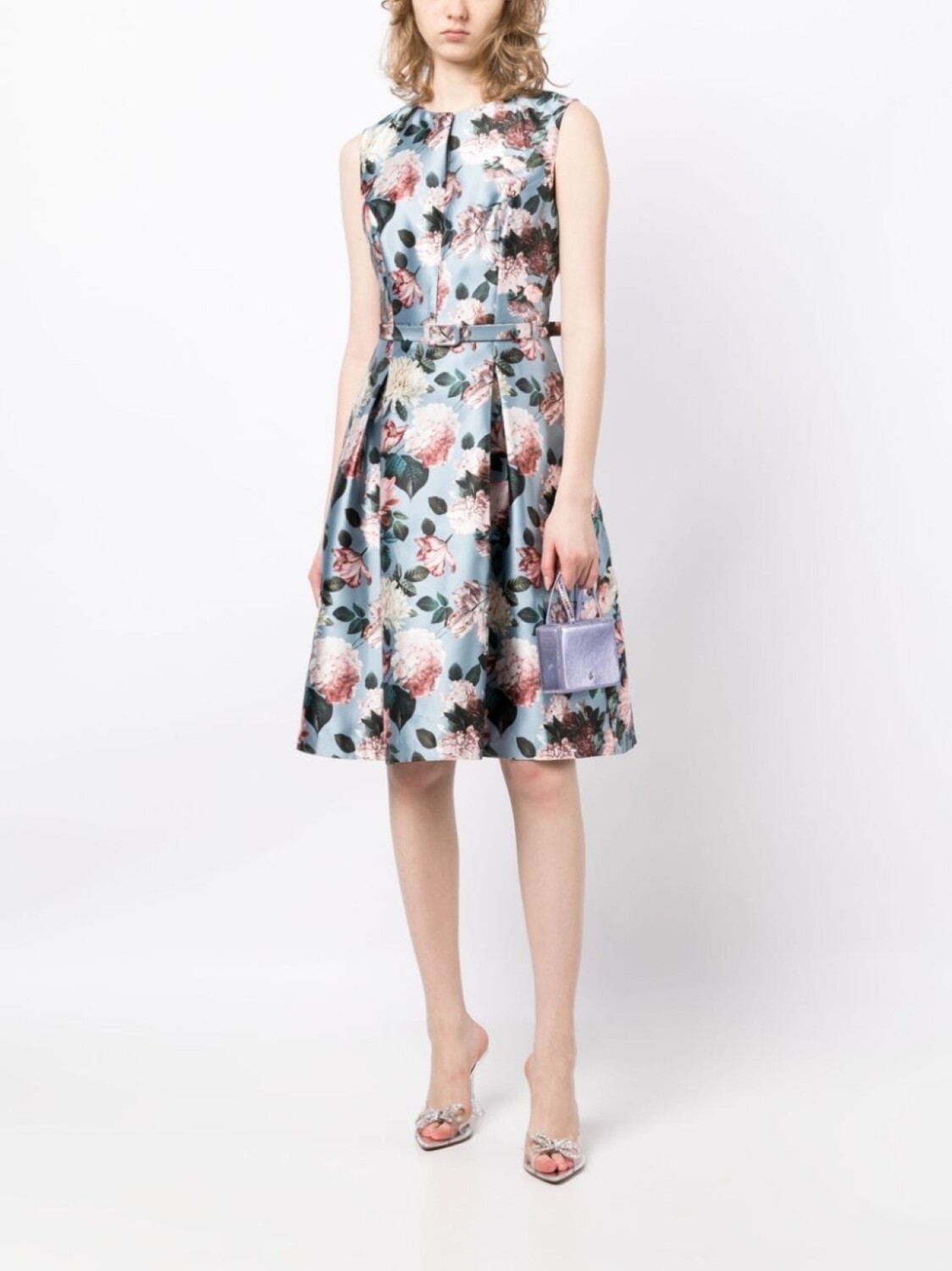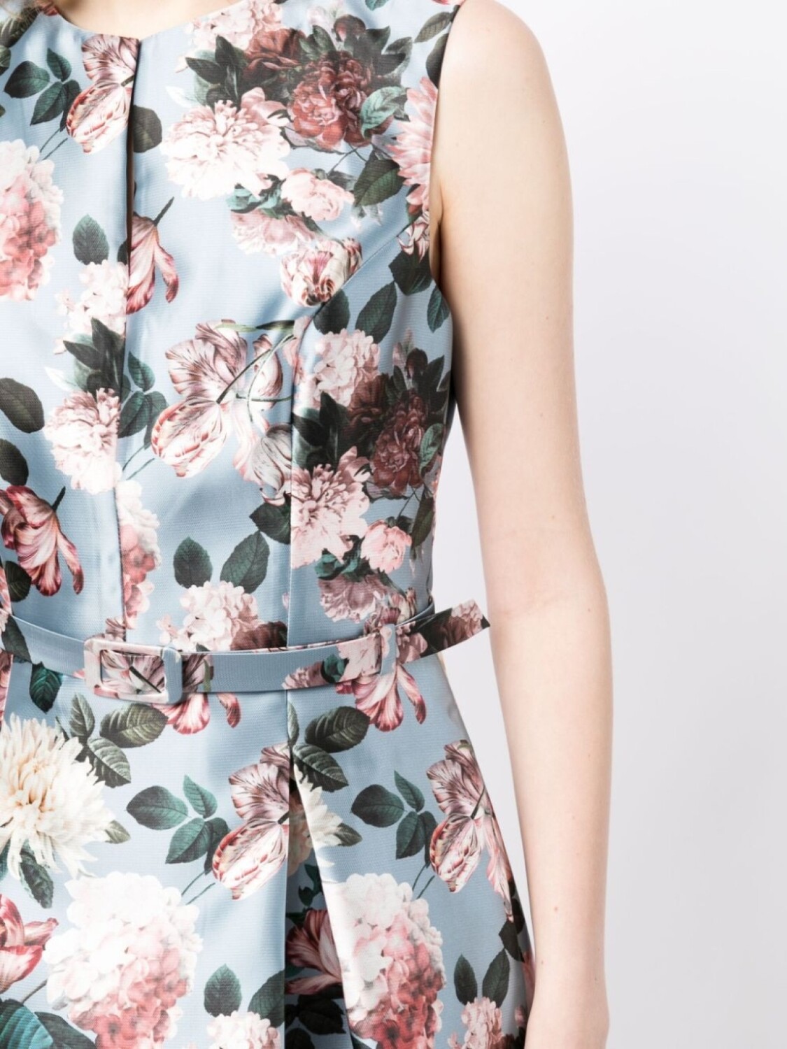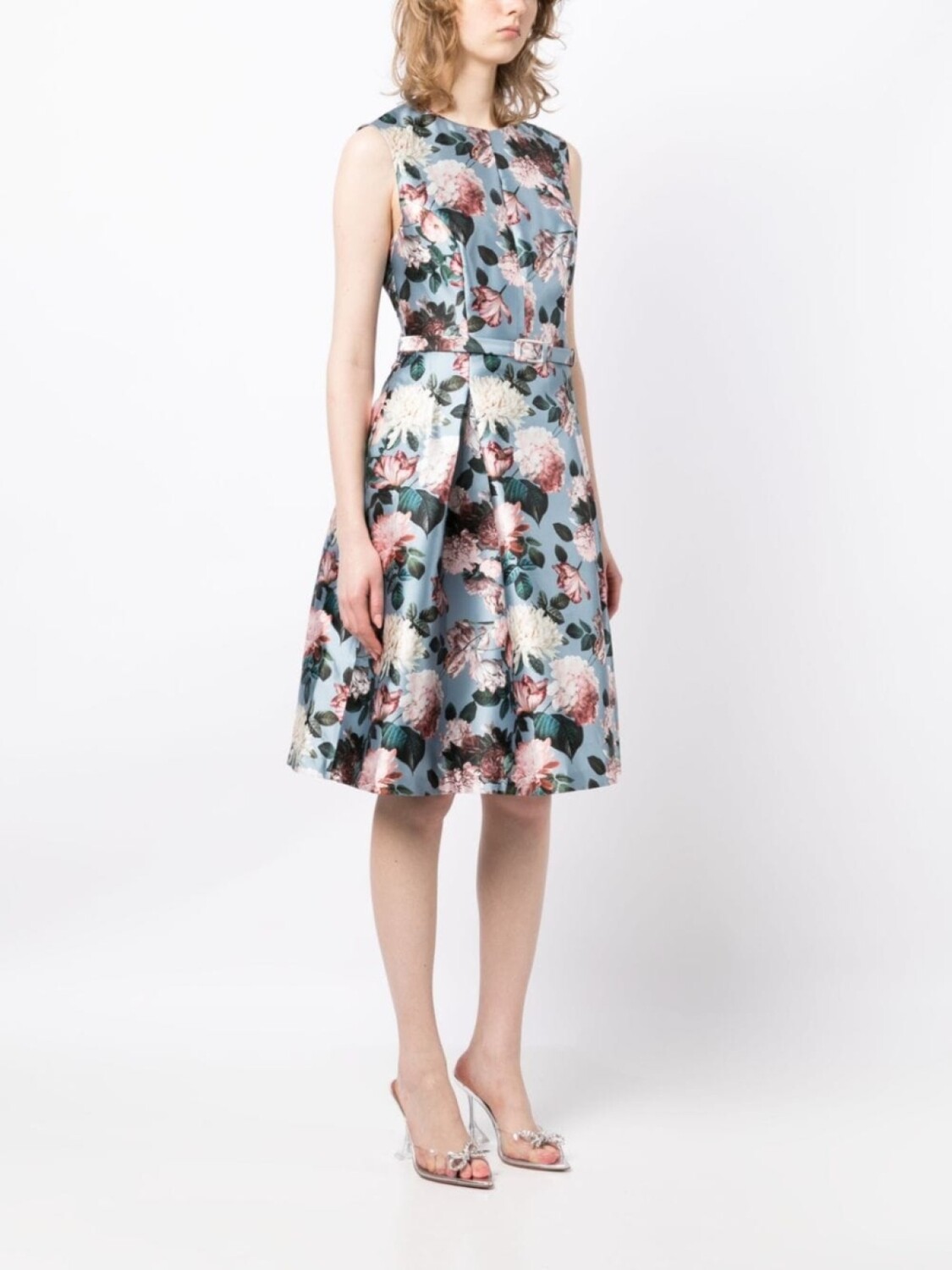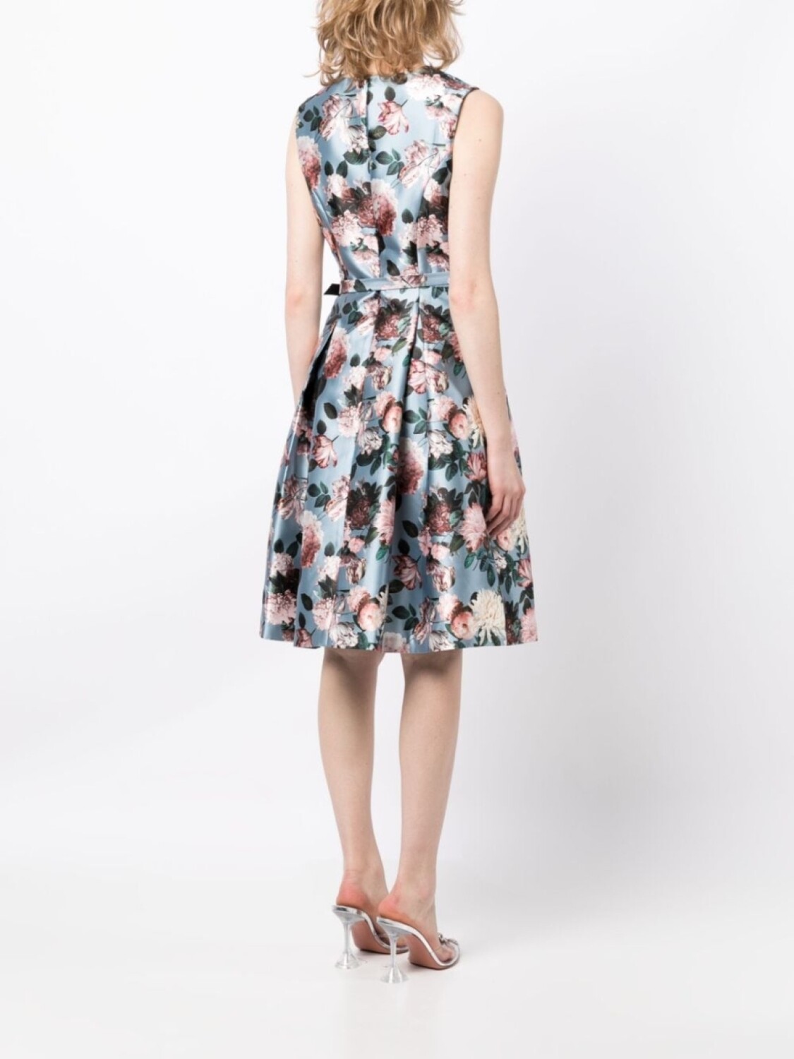 Сатиновая фактура, сплошной цветочный принт, складки, круглый вырез, потайная застежка спереди и потайная застежка на молнии сзади.