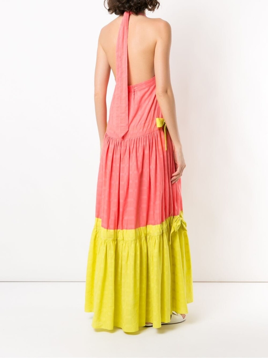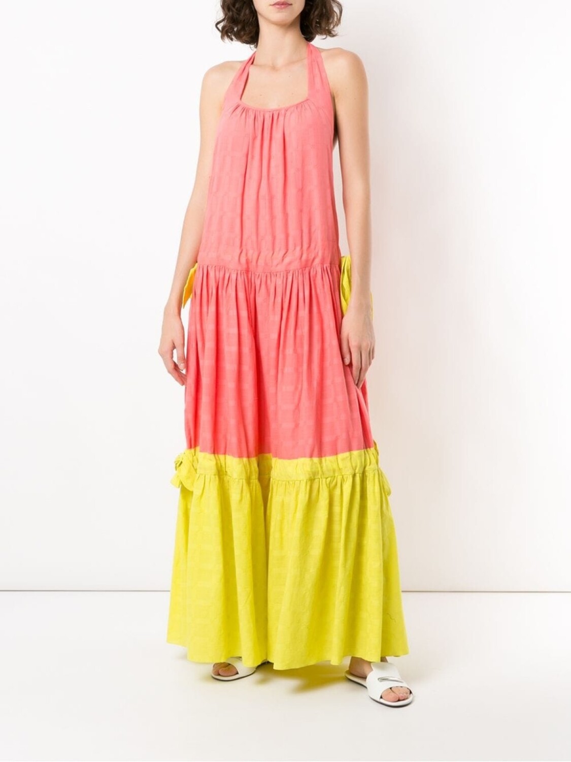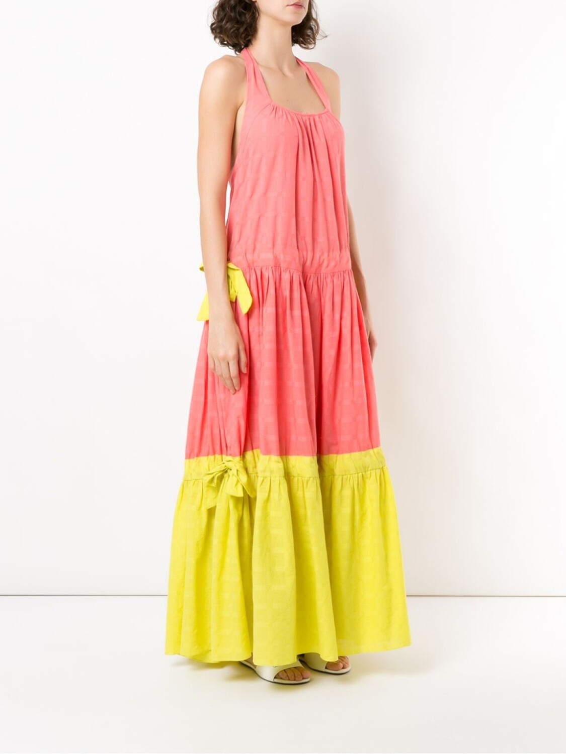 Платье макси Wocky от Clube Bossa. Вырез-петля халтер, застежка на завязке сзади, присборенные детали, удлиненная модель и расклешенный силуэт.