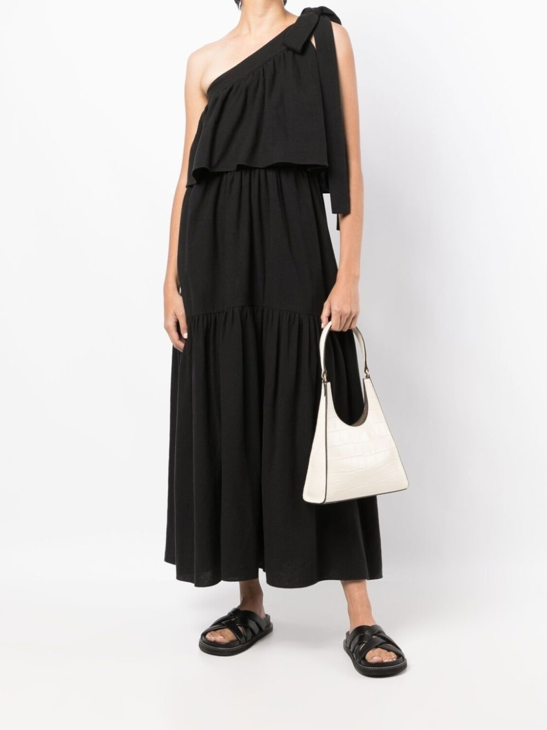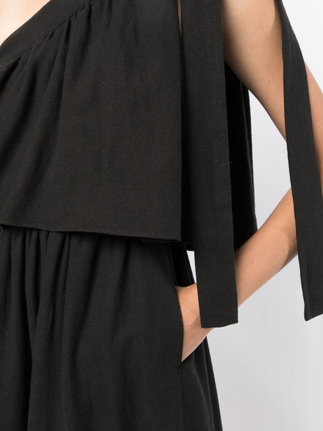 Вставки с оборками, модель на одном плече, без рукавов и длинная модель. Цвет: черный.