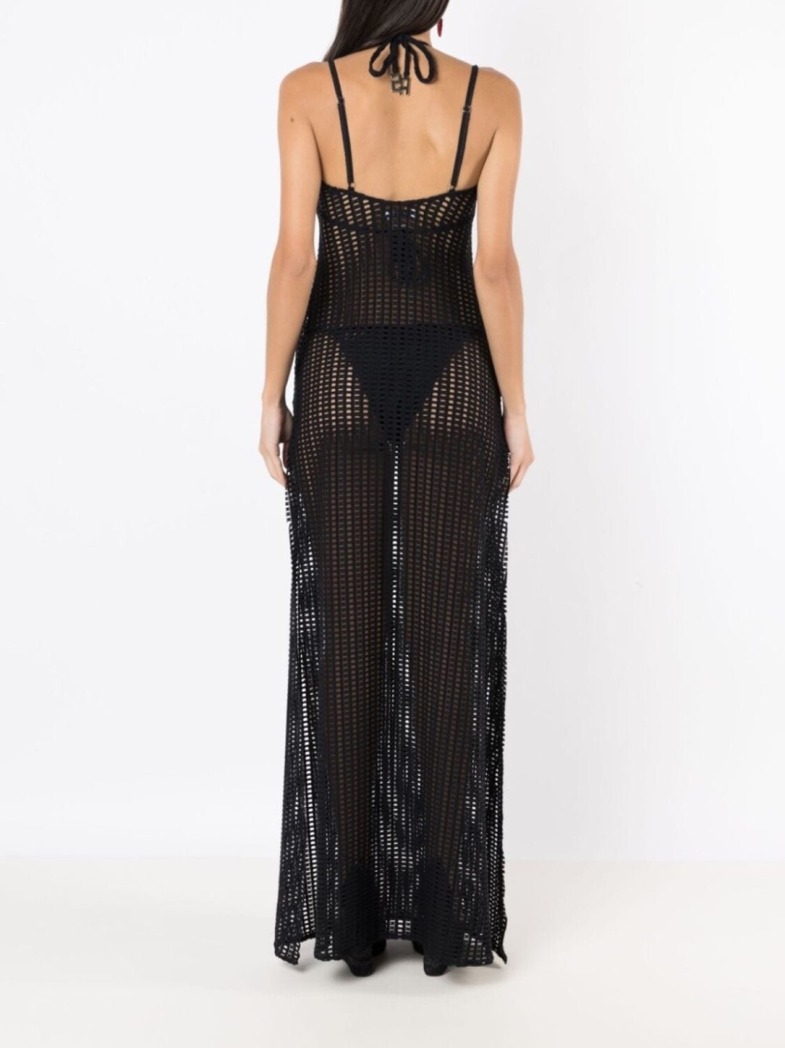 Черный, ажурная вязка, круглый вырез, тонкие бретели и длинная модель.