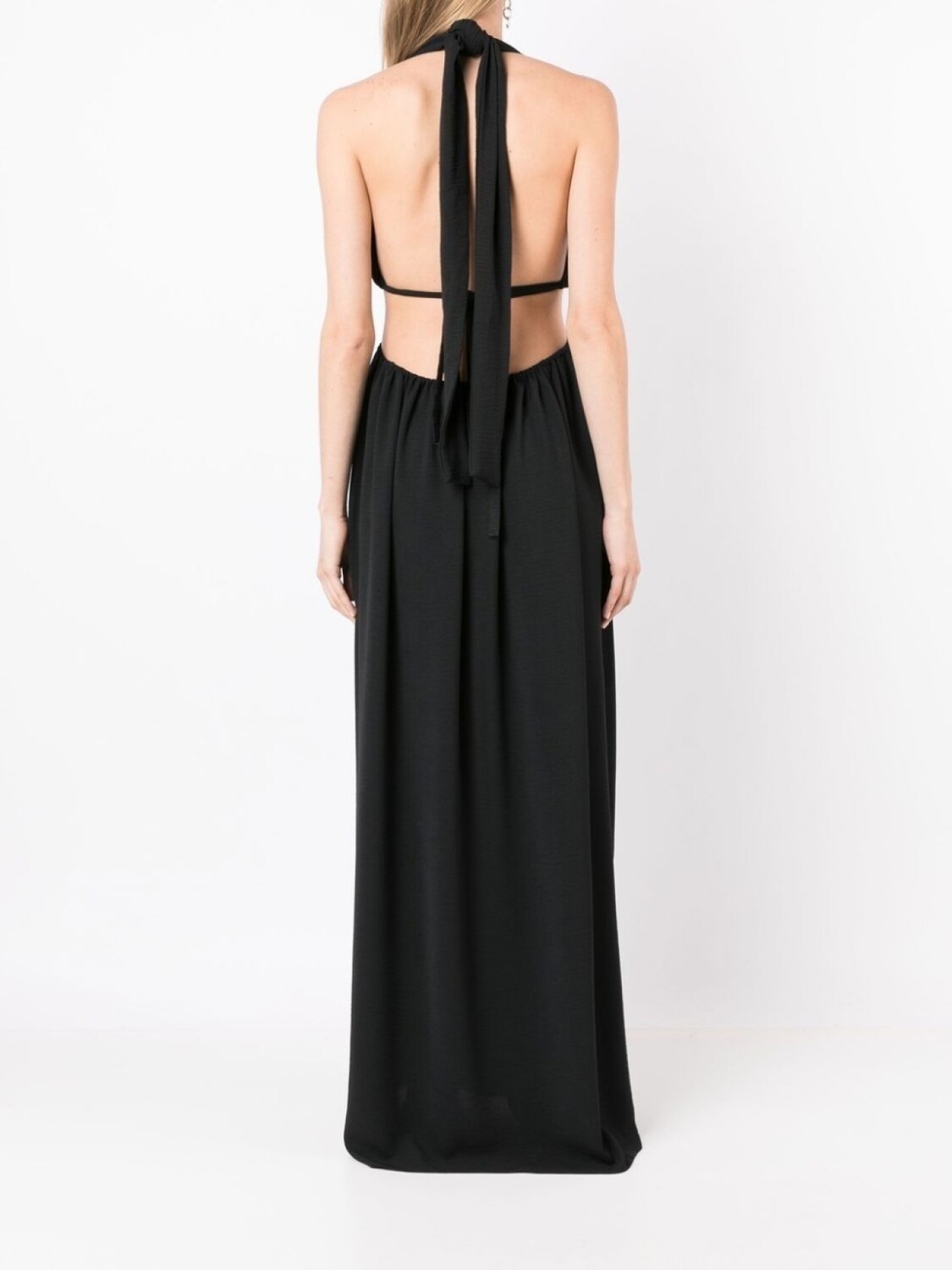 Черный, вырезные детали, металлические кольца, вырез-петля халтер, застежка на завязке сзади, без рукавов и длина макси.