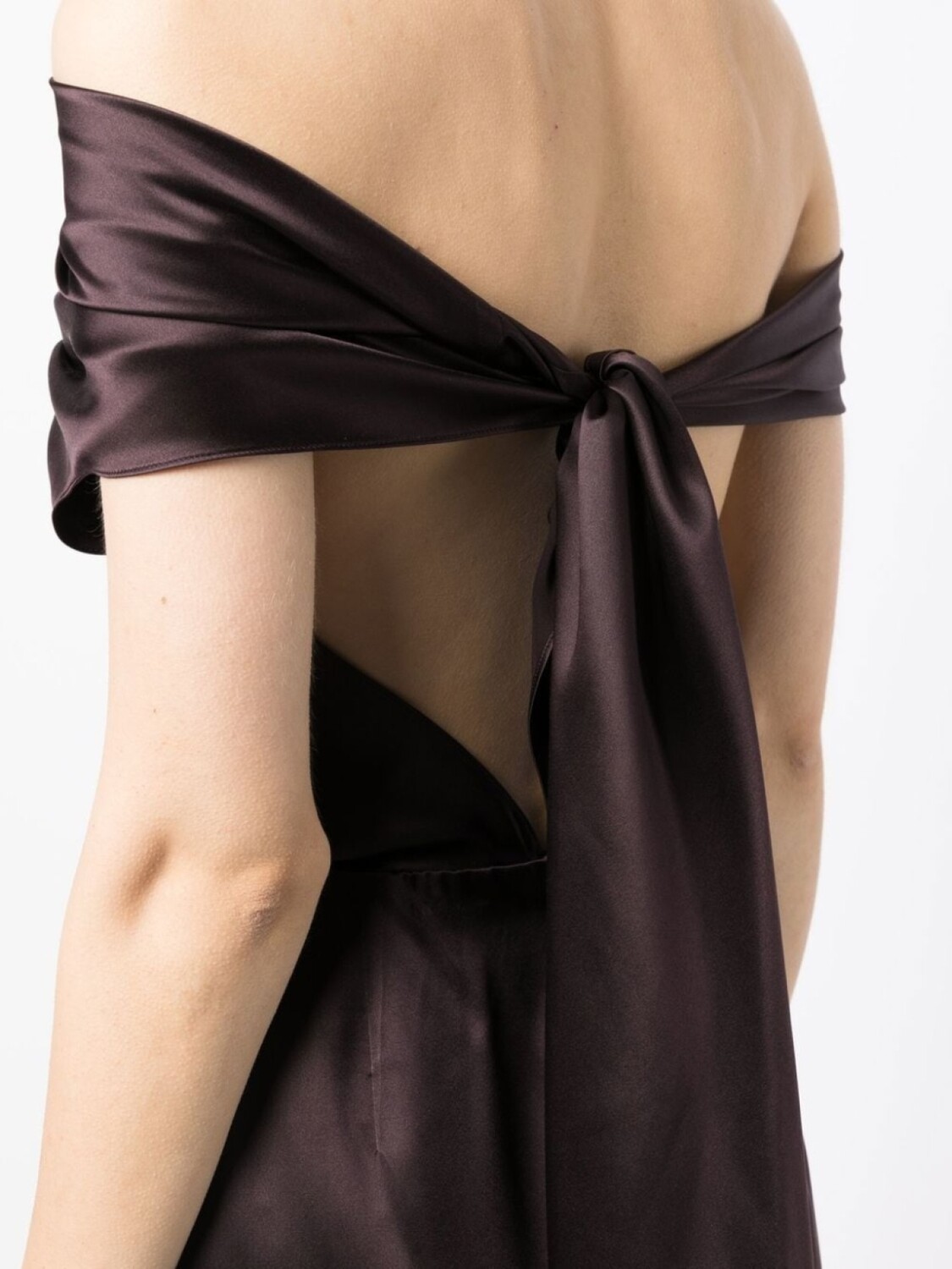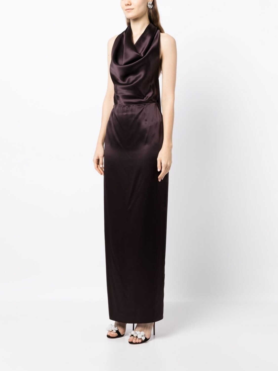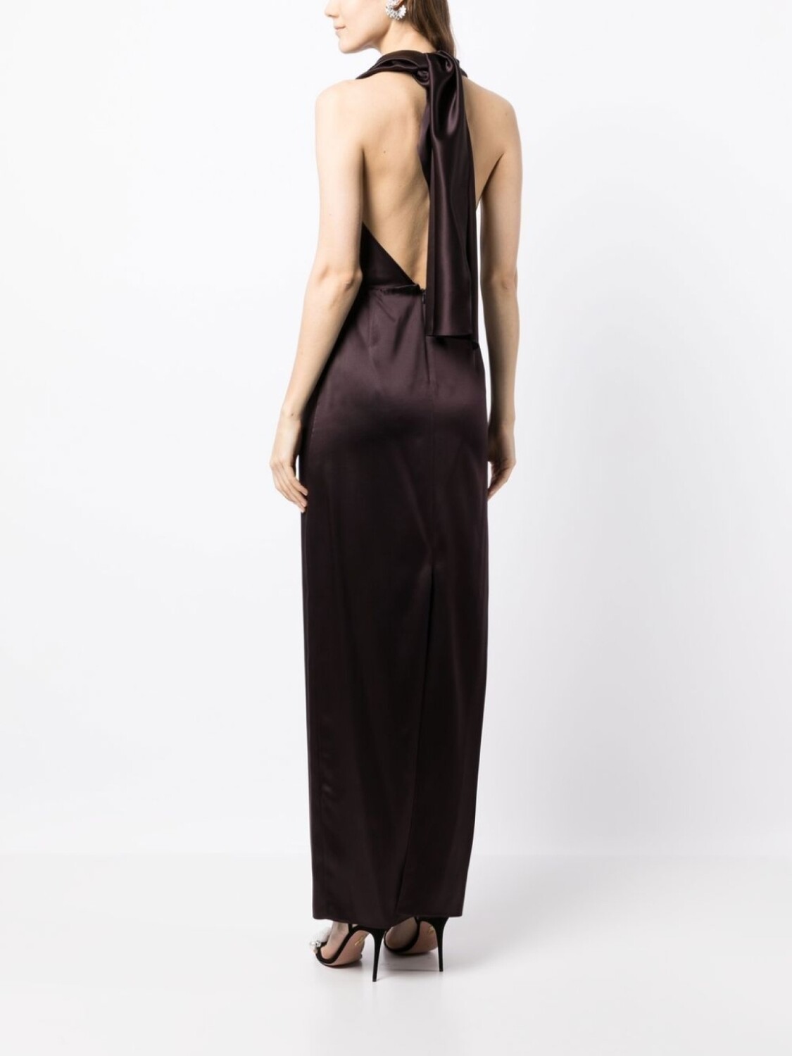 Коричневый, шелк, сатиновая фактура, воротник-хомут, завязки вокруг шеи, застежка на молнии сзади и длинная модель.