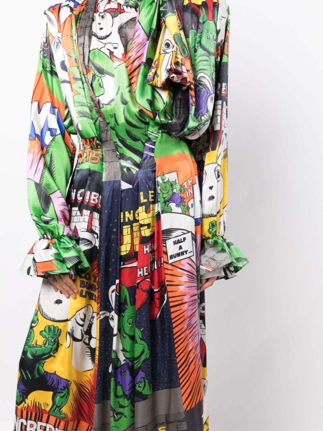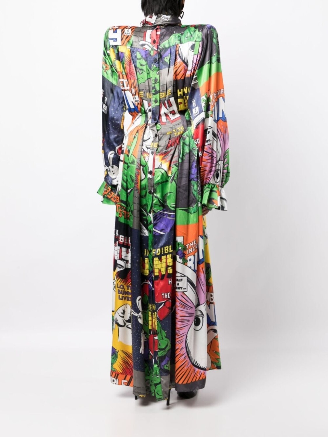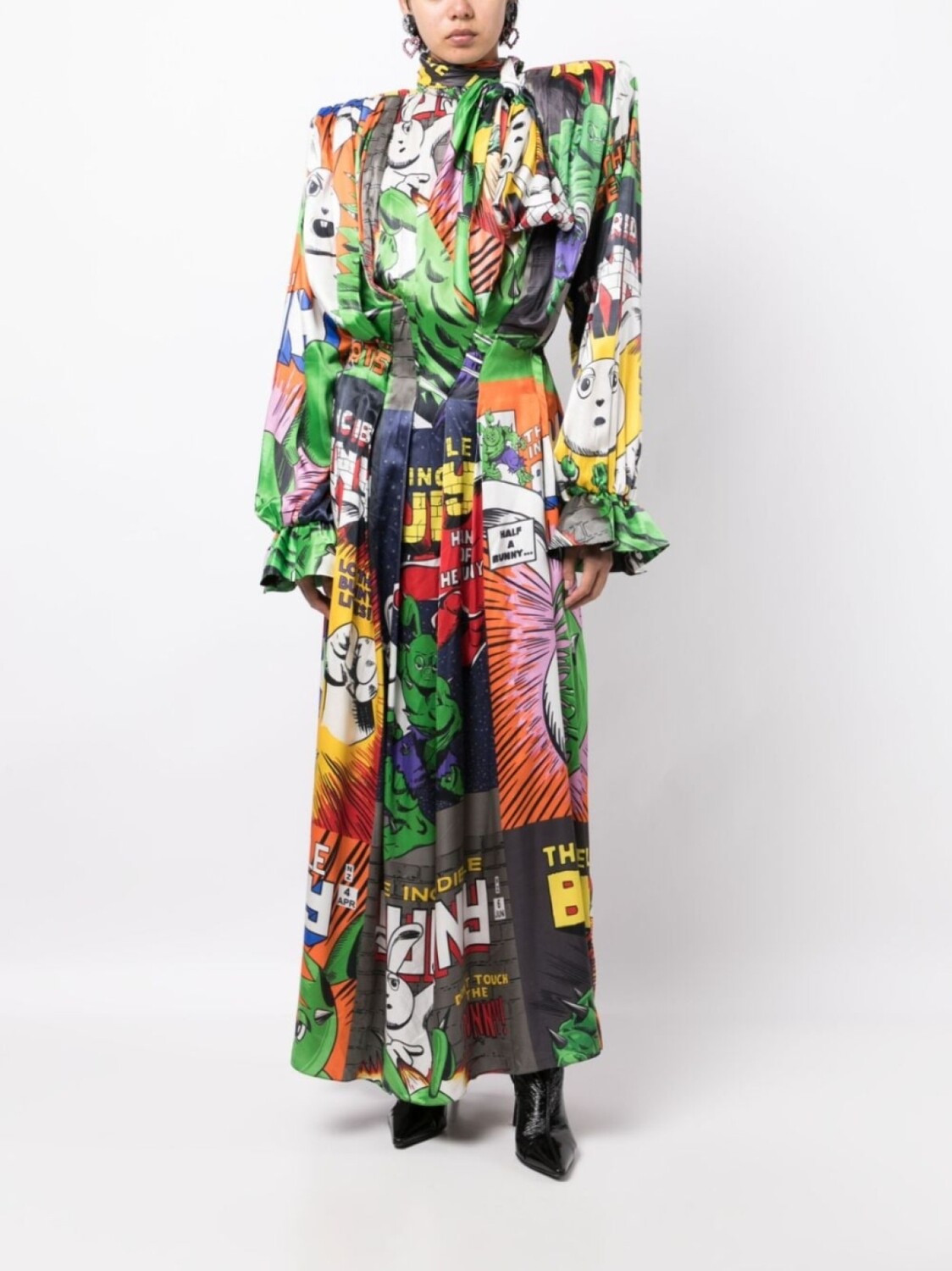 Разноцветный, сатиновый финиш, мультипликационный принт, юбка со встречной складкой, бант спереди, застежка на пуговицы сзади, подплечники, объемные рукава, манжеты с оборками, расклешенный подол и длинная модель.