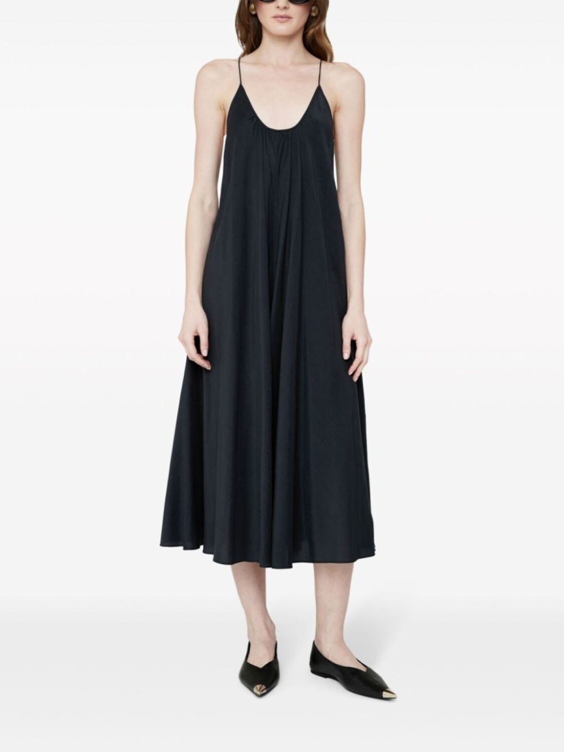 Черный, смесовый хлопок, U-образный вырез, тонкие бретели, дизайн со сборками, длина миди, прямой подол