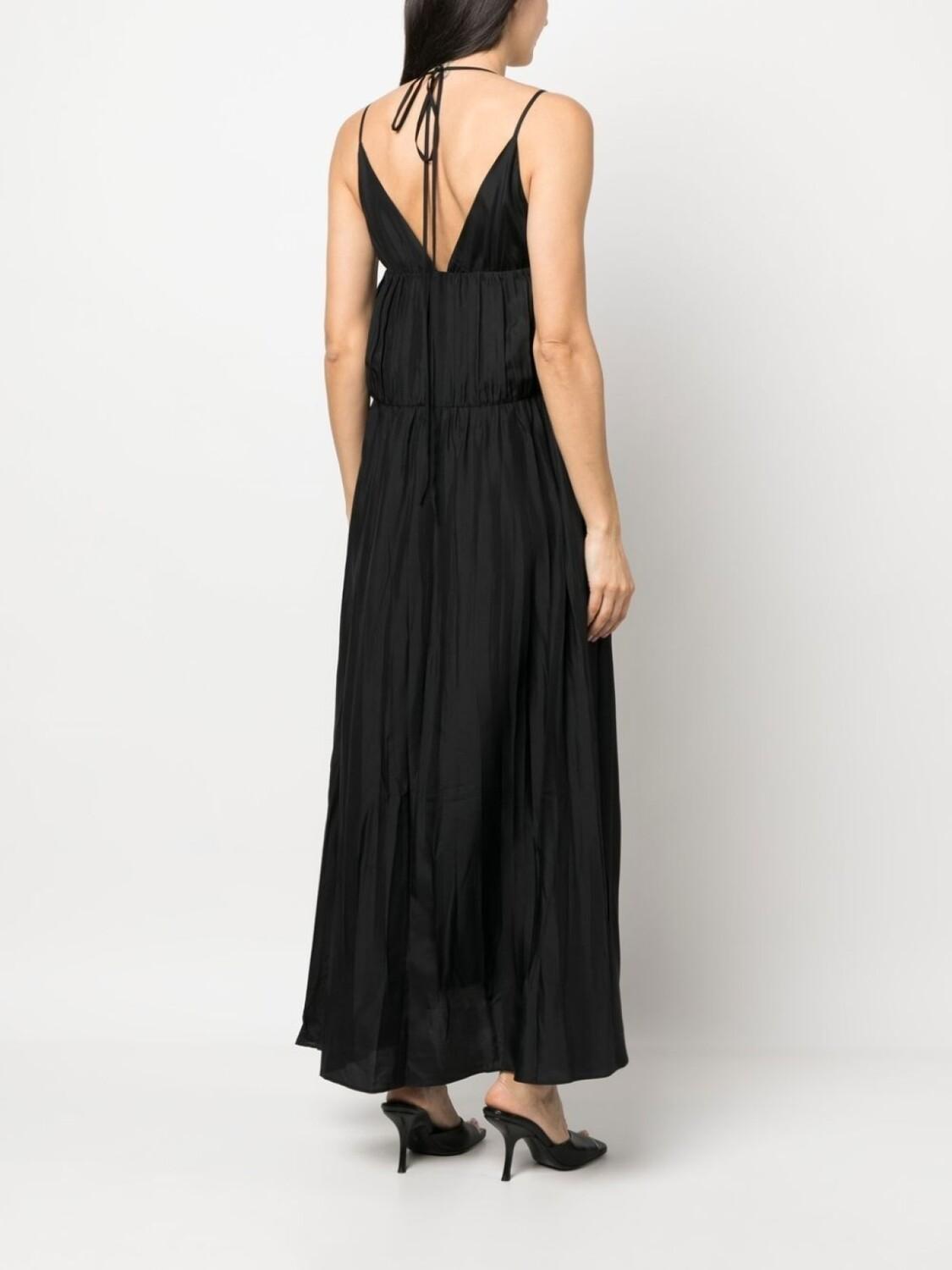 Черный, шелковый, рюши, глубокий V-образный вырез, V-образный вырез на спине, завязка на шее, бретельки-спагетти, большая длина.